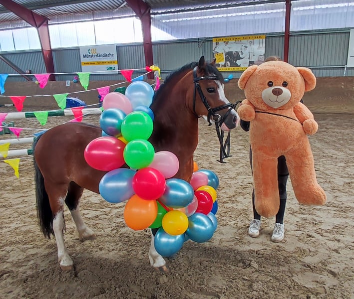 **Sales Advertisement: Charming Welsh-A Gelding for Sale!** We are looking for a loving new home for our beautiful Welsh-A gelding! Vaccinated, dewormed, regularly shod, and teeth floated by the veterinarian. This young gelding is ideal for leisure activities and is excellent for relaxed riding as well as various activities. He is well-mannered, friendly in handling, and has a great character. Child-friendly and open-minded, he can be handled/groomed/lunged/saddled by children. He is healthy, well-socialized, and has already gained initial experience with children and other animals. "Dickie," as he is affectionately called, is used to being handled by children from the age of 6. He loves lunging sessions with children from 5 years old, showing reliability and patience. He enjoys jumping in the woods or in the arena, demonstrating talent and maintaining overview. When riding in a group, he can be used as the first or last pony. Dickie is also familiar with pony games, has been ridden both with and without a saddle, and has participated in costume riding! If you are looking for a loyal companion for leisure and beautiful moments in nature, then "Dickie" is just right for you! For interest or further questions, please call. Videos are available and can be sent via WhatsApp.