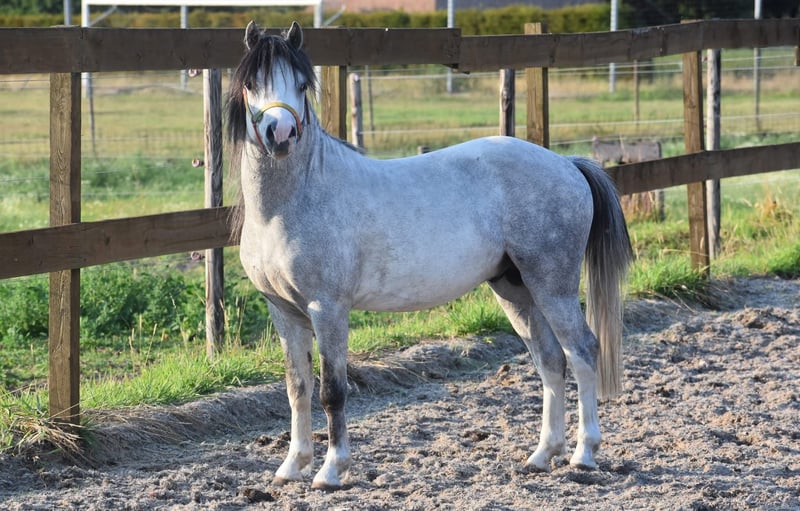 Cuppers Winston is de naam van deze , bijna 4 jarige spetter! Zijn roepnaam is Blue Boy. Hij heeft dan ook een prachtige , blauwe appelschimmelkleur. Hij heeft een fantastische stamboom, klik hier voor zijn papier : Eindegooi’s Pretty Charmer x # Oldenzijlster Action Man x #Vechtzicht’s Cymro Bach. Hij heeft een prachtige, volle en toch chique bouw. Een hoofdje zó uit een Disney film geknipt. En zijn gangen zijn spectaculair ! Er is al veel grondwerk gedaan met Blue Boy en hij is hier en voorheen dan ook superbraaf in de omgang en in de trailer, op stal en in de wei. . Winston is nu een ruin, maar als hengst was hij al superbraaf. Hij groeit nu de hoogte in. Is een grote B maat. Het is een ontzettend meewerkende, superlieve ruin . Hij vindt het gezellig om te rijden en wil graag verder groeien: voor de recreatie is hij hier braaf genoeg, maar als sportpony is hij ook zeer geschikt. We verwachten dat hij heel makkelijk te beleren is voor de koets, wat zal dat een prachtig plaatje zijn! Hij vindt het superleuk om te rijden en is hier vanaf het begin braaf mee, we konden vanaf het allereerste begin meteen zonder problemen op hem gaan zitten. Prijs 4750,- incl. merkzadel en dekje