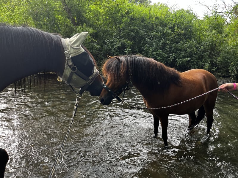 Schoko ist ein 5Jahre alter, Isi -Welsh Mix der 1,12m gross ist. Vermutlich aber noch minimal wächst. -Dornkappen- Er ist Tetanus geimpft, Hufe werden regelmäßig alle 4/5Wochen durch eine Huf Orthopädin bearbeitet. Zähne werden einmal im Jahr kontrolliert und ggf optimiert. Schoko liebt Bodenarbeit jeder Art, Trail Aufgaben und das Wandern. Mit Kids ab 10Jahren arbeitet er gern zusammen am Boden. Kleineren Kinder gegenüber ist er stets aufgeschlossen und neugierig zugewandt, durch ihre meist noch nicht so klare Körpersprache ist er in der Arbeit eher unsicher und kompensiert das durch Schnelligkeit. Wir haben ihn an Decken, Longiergurt und Gewicht am Rücken spielerisch gewöhnt. Er erträgt es brav, ist aber noch lange kein Reitpony oder Kinder führ Pony. Wenn er in den Situationen nicht genug Sicherheit durch seinen Menschen bekommt steigt und buckelt er bis er alles los geworden ist. Wenn etwas schnell und plötzlich auf ihn zu kommt ist er skeptisch und regiert ohne weitere Überlegung mit Flucht. Radfahrer, Autos Hunde oder ähnliches sind kein Problem. Hänger fährt er gern und fühlt sich auch an fremden Orten schnell wohl. Hauptsache seine Menschen sind für ihn da. Im täglichen Umgang ist Schoko ein freundlicher, zuverlässiger, treuer Schatz der seinen Menschen in der Arbeit gefallen möchte. Er sollte aber auch spätestens jeden 2. Tag gearbeitet werden, weil er sonst nicht ausgelastet ist. Auch nicht im aktiv Stall. Alles schon getestet. Wenn er nicht ausgelastet ist, lässt er seinen Frust an der ganzen Herde aus. In der Herde ist Schoko sehr Rang hoch, legt sich auch gern mal mit dem Chef an. Spielt gern und ist aber auch da für jeden Spaß zu haben. Stute beansprucht er gern für sich und reitet auch auf. Daher würde ich ihn NICHT in eine gemischte Herde stellen. Ist für den kleinen Mann nur unnötiger Stress. KEIN Kinderpony Keine Reitschulen oder Händler Bei weitern Fragen gern melden
