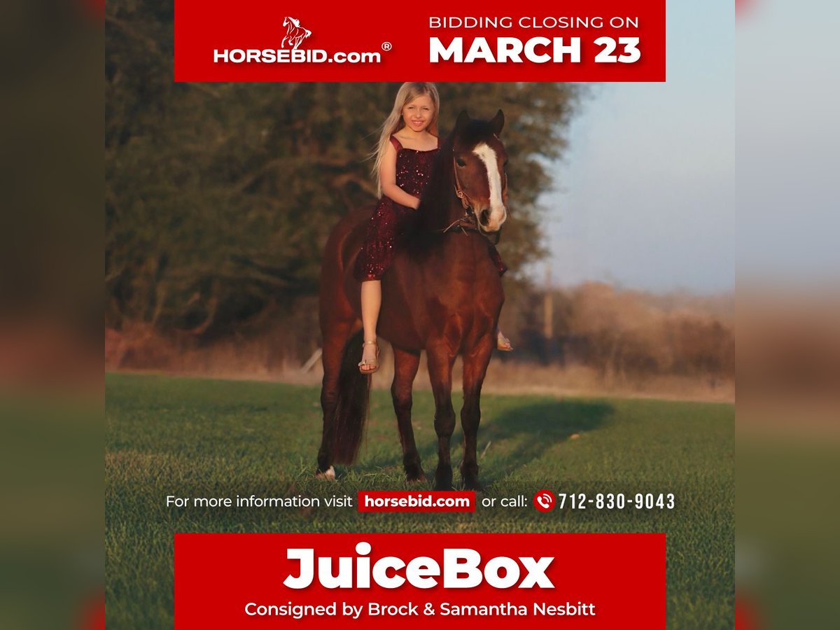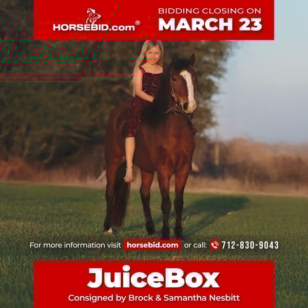 ⚜️𝓽𝓱𝓮 𝐆𝐎𝐋𝐃 𝓢𝓮𝓵𝓮𝓬𝓽⚜️ Happening now thru MONDAY | MARCH 23rd - Available EXCLUSIVELY on HorseBid's website! For more details and to register visit: www.Horsebid.com CONSIGNOR CONTACT: Brock & Samantha Nesbitt 712-830-9043 LOCATION: Stephenville, TX BREED: Welsh Pony REGISTERED: Yes REGISTERED NAME: RAMBO’S MIRROR COLOR: Bay HEIGHT: 12.1 AGE: 7 GENDER: Gelding If you have been waiting for a pony that does not look like a pony, here he is! This seven-year-old papered gelding sets himself apart the moment he walks into view. He has plenty of chrome, balanced conformation, and a refined, pretty head that mirrors the look of a high-dollar big horse. There is nothing coarse or common about him. No heavy pony head, no thick jaw, no ordinary outline. He is clean, sharp, and elegant from every angle, the kind that draws attention without trying. You will look long and hard before you find another one built and presented like this. He moves like a performance horse. Smooth, fluid, athletic, and naturally balanced, he carries himself with presence and power. He is responsive and intelligent. He has a really nice stop, stays collected. JuiceBox is sharp in the right way — athletic and smart. This is a gelding with feel and trainability. He has been started on the roping sled and is comfortable around ropes, cattle, and other horses. He loads and hauls well, stands tied, and picks up his feet. He has seen enough to be confident, and at the perfect age of seven years old he is just stepping into his prime with his entire life ahead of him. Whether you want to finish him into a serious barrel pony, a breakaway prospect, he has the athleticism and mind to go on in any direction. As well as the looks to step into the show pen. One of the rarest qualities about him is his size and build. He is small enough to be ideal for youth riders, yet big enough for an adult to step on comfortably. That versatility alone is hard to find. Combine that with his eye appeal, presence, and athletic ability, and you have something truly uncommon. He has the kind of look that belongs in the show ring and the ability to back it up. You can buy ponies every day. You cannot buy this level of class and refinement every day. Quality like this is rare, and the buyers who understand it recognize it immediately. If you are looking for ordinary, he is not your pony. If you are looking for exceptional, he is ready to meet the standard.