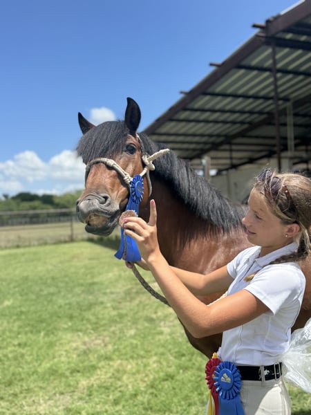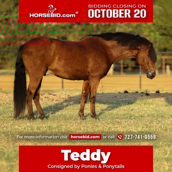 ♦️ 𝐭𝐡𝐞 𝐀𝐌𝐄𝐑𝐈𝐂𝐀𝐍 𝓕𝓪𝓵𝓵 𝓒𝓵𝓪𝓼𝓼𝓲𝓬 ♦️ Happening now thru MONDAY | OCTOBER 20th - Available EXCLUSIVELY on HorseBid's website! For more details and to register visit: www.Horsebid.com CONSIGNOR CONTACT: Ponies & Ponytails 727-741-0559 LOCATION: Cleburne, TX BREED: Welsh x Warmblood REGISTERED: No COLOR: Bay HEIGHT: 13.2 AGE: 8 GENDER: Gelding If you want the fanciest true all around pony.. this is your guy!! Teddy is a 8yr old 13.2h bay welsh x warmblood cross gelding. ENGLISH EXPERIENCE: This guy is a tried and true all arounder!! He’s been successfully shown in the hunters, jumpers, equitation and cross country!! You point and he tucks those little legs as cute as can be and gives you the best little jump he’s got every time!! No silliness!! No prep required!! This pony loves his job!! Teddy is also very competitive on the flat!! He’s got phenomenal movement!! Just watch his videos!! The flattest little trot and that canter is amazing!! So incredibly smooth he makes the equitation classes a walk in the park!! He catches his leads every time and he’s close to being finished on his lead changes!! He’s got very easy transitions up and down. Listens well to voice and responds well to your seat and leg. This is the pony that will take the kiddos to the next level. He’s quiet and easy enough to show in the cross rails yet talented enough to be competitive in the 2’3-2’6”. He’s been successfully shown already in the 2’3” and schooled courses at home up to 2’9” with more room to move up! WESTERN EXPERIENCE: If English isn’t your thing.. Teddy is happy to do the western events! He will gladly go to the playdays and do the barrels and poles. He’s very easy to maneuver and very respectful of his riders cues. You can ask him for all the speed then turn him right off and he will drop his head and walk quietly. He will go trail riding all day long and go anywhere you point him! Teddy will ride in the front, back or middle. Doesn’t mind wildlife, traffic, dogs or goats. He will go up steep hills like a mountain goat and he lovesss to play in the water!! He’s got a nice easy walk, jog, lope and a nice easy little neck rein! DISPOSITION: Teddy should suit just about any program! From the lesson barns to the show barns. He’s got a wonderful disposition and the coolest in your pocket personality!! Teddy is the kind of pony you don’t find everyday. From his training and experience to his bubbly barn favorite personality. He meets you at the gate every time and smiles for cookies! UPKEEP: Teddy is a very easy keeper. He eats alfalfa hay and a 1/2 scoop of a basic pelleted grain twice a day. UTD on all. Currently in a basic front shoe for jumping support. He has been and can easily go barefoot. LOADING: Teddy loads and unloads very easily. He hauls great and stands quietly tied to the trailer. TURNOUT: Teddy can go out alone or in a group setting. He’s been out with mares and geldings without drama. GROUND MANNERS: Teddy is very quiet on the ground. He stands well for washing, grooming, farrier, saddling and he’s easy to bridle. You can single tie or cross tie Teddy. He’s quiet with dogs and goats running around him as well. BAD HABITS/VICES: Teddy has NO bad habits or vices. No buck, rear, bolt, bite or kick. TACK: Teddy rides in anything from a halter and lead rope to a smooth snaffle to a slow twist snaffle. Super easy. Not fussy.