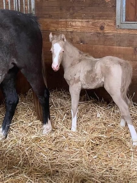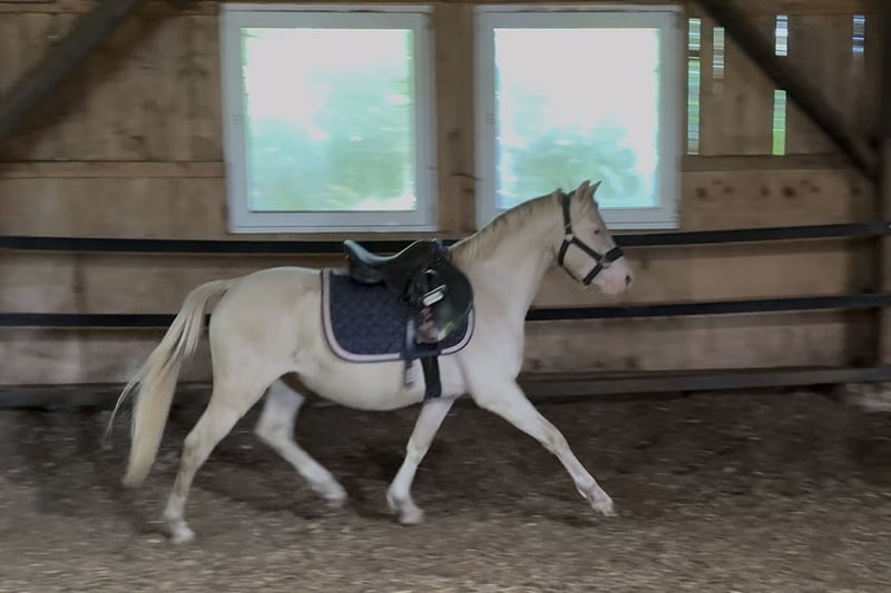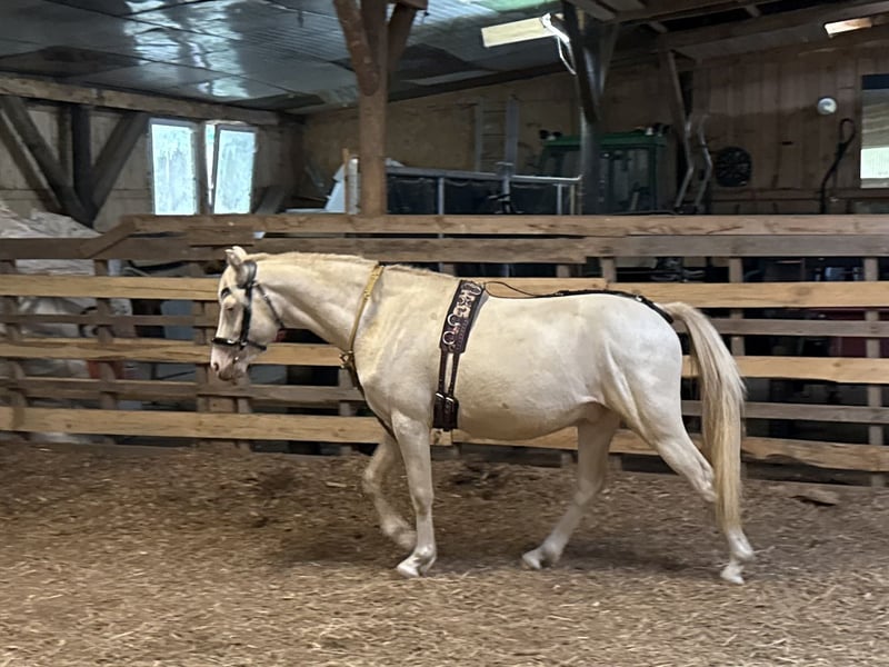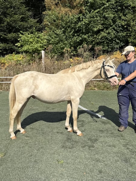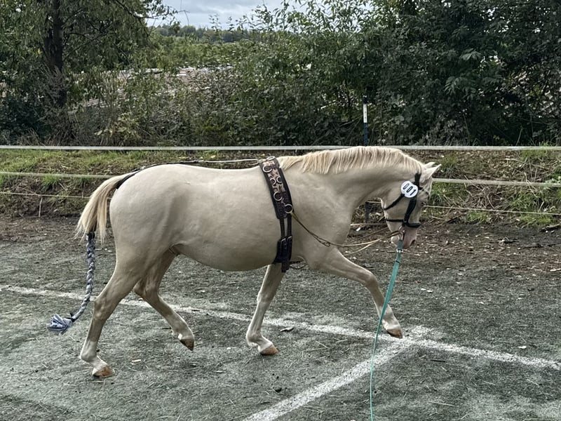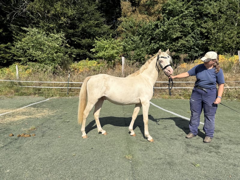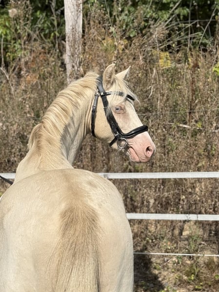 Renaissance Croissant Royale Welsh B 10.03.2023 123 cm aktuell EM ca 130 cm Rappweißisabell, smoky cream Vater: Carrwood Tom Ellis Mutter: Renaissance Cheikha Mozah Muttervater: Tijd Vlijts Black Berry Regelmäßig ausgeschnitten, entwurmt und geimpft Unsere kleine Farbsensation sucht 5* Zuhause Getestet Rappweißisabell bzw smoky cream (aaEe CRCR) ist Crossie etwas ganz besonderes! Grundfarbe Rappe in doppelt aufgehellt brächte er immer zu 100 % aufgehellte Fohlen. Smoky Black, Palomino una Buckskin abhängig der Stute. Aber nicht nur das macht ihn besonders, denn für ein so junges Pony ist er unheimlich brav. Typisch Welsh hat er eine Lieblings-Bezugsperson, aber auch mit jedem anderen ist er brav im Umgang. Egal ob als zukünftiger Hengst, Fahr- oder Reitpony wird er viel Freude bereiten. Er ist nie aggressiv oder böse, beißt und Tritt nicht, ist brav bei Tierarzt und Schmied, lässt sich verladen und steht gut auf dem Hänger. Neugierig und freundlich ist er einer der Lieblinge bei uns im Stall. Er wurde auf dem belgischen Erfolgsgestüt Renaissance geboren, wo auch seine Mutter schon gezogen worden ist. Sein Vater stammt aus England und hat bereits in den Niederlanden, Tschechien und Belgien züchterisch gewirkt. Im Letzten Jahr wurde der Vater als Deckhengst nach Brasilien exportiert. Außerdem ist er ein braves Kinderreitpony, neben seiner Zuchtkarriere. Crossie hat einen überragenden Trab, einen für Welsh eher untypisch sehr guten Schritt und einen guten Galopp. Bis August hat er rundum das Jahr mit Hengsten und Wallachen jeden Alters und Größe zusammen im Offenstall in der Herde gestanden und ist völlig unproblematisch in der Gruppe. 24/7 Heu, im Sommer zusätzlich Wiese, Mineral zur freien Verfügung und befestigem Trail. Wir haben ihn dem Alter entsprechend langsam ins Training genommen. Inzwischen kennt er Freilauf, Longe, Trense, Gurt, Sattel, Schweifriemen und Stangenarbeit in allen Grundgangarten und lässt sich brav an der Hand mustern. Wäre sofort bereit um in die Kör-Saison zu starten! Kann aber auch zeitnah hier gelegt und weiter ausgebildet werden. Wir bieten sowohl das Einreiten, als auch das Einfahren an. Gerne darf er dafür auch im nächsten Jahr wiederkommen und den Winter über noch seine Jungend genießen. Kennt Trecker, Hunde und Kinder jeden Alters, ist aber aufgrund des Alters natürlich noch kein fertiges Kinderpony. Hat noch nicht gedeckt und auch kein Hengstgehabe. Crossie kann gerne nach Absprache kennengelernt werden. www.ponyzucht-kaiser.de