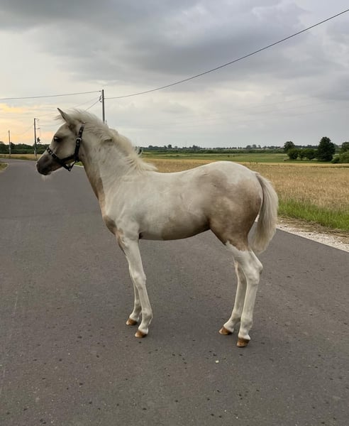 Tout comme sa robe d'origine palomino pie (confirmée par les tests génétiques homozygote au Locus E - génotype T/T(e/e), hétérozygote au Locus C génotype A/G( Cr/N)). Elle a un caractère fort et une sensibilité au contact de l'humain. Dès sa naissance, elle a été élevée en liberté, ce qui garantit à l'avenir une bonne musculature, idéale pour le sport. La jument est vaccinée, vermifugée selon le calendrier, sous les soins constants du maréchal-ferrant. Passeport AES. Taille estimée 130-135 cm. Née le 25.03.2025 Par Ares welsh pony ( Wolling’s Dante welsh – Apasjonata Dumka welsh/ Kienbergs Doro welsh) Norwegian Wood ( Nando Super - Bisia) Sa mère a fait des preuves dans le sport en saut d'obstacles, avec une taille de 130 cm, des concours documentés jusqu'à 100 cm. Je fournis le document TRACE nécessaire pour le transport international. No tel. /WhatsApp + 33 660836193, FR,EN, PL No tel./WhatsApp + 48 883992001, FR,EN,PL