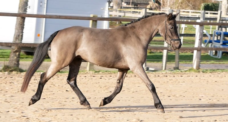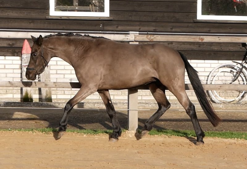 Doutzen, que nous appelons Doortje dans notre écurie, est une jument noire magnifique. Très douce en manipulation. Elle accepte de donner ses pieds, de rester en place, de marcher calmement en longe, ainsi que de se faire brosser et raser sans problème. C’est un poney qui adore travailler. Elle aime faire des exhibitions et reste toujours motivée. Elle connaît déjà le travail en longe avec une seule ligne et en longues lignes doubles. Elle a également porté un filet simple et un bridon, ce qui ne lui a posé aucun souci. Chaque semaine, elle part en promenade en main, que ce soit le long du chemin ou en forêt. Elle est toujours très calme et volontaire lors de ces sorties. Elle ne se laisse pas facilement impressionner par la circulation ou d’autres éléments que l’on peut rencontrer lors d’une promenade à l’extérieur. Je pense que Doortje s’épanouirait idéalement comme poney de loisir ou poney de dressage. Elle adore travailler et possède trois allures de qualité. Nous continuerons à l’éduquer tranquillement dans les semaines à venir, et son prix augmentera à mesure de l’avancement de sa formation. Le seul petit inconvénient de Doortje est qu’elle peut avoir des démangeaisons en raison d’un régime riche en sucre. Elle ne reçoit que du foin, un peu de granulés sans céréales ni luzerne. De cette façon, elle ne souffre pas de démangeaisons.