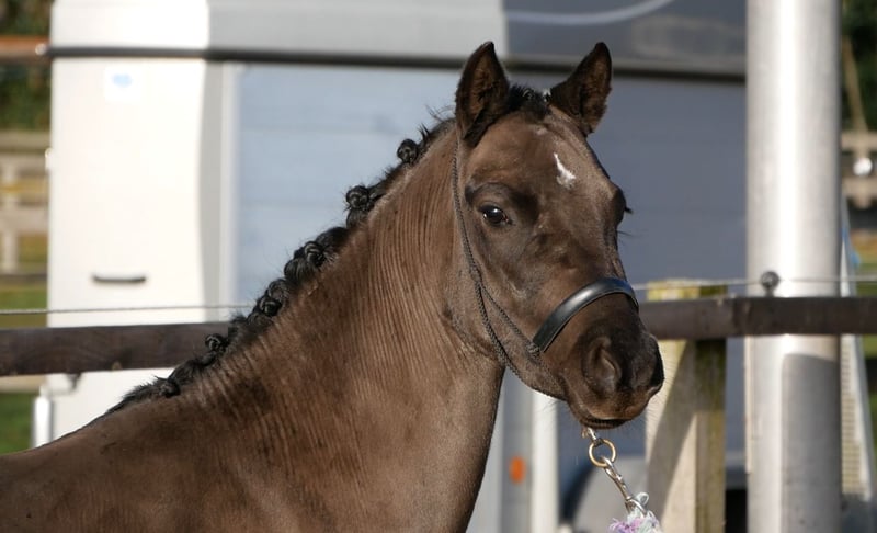 Doutzen, known as Doortje at our stable, is a beautiful black mare. She is very well-behaved in handling. Giving her feet, standing tied, walking calmly on a lead, grooming, and clipping are all no problem. She is a pony that loves to work. She enjoys performing and is always motivated. She is familiar with lunging on a long rein and double long lines. She has also worn a surcingle and a bridle, all without any issues. Every week, she accompanies us on outdoor rides as a lead pony. She rides along the road and through the woods. She is always very calm and eager to work. She is not easily spooked by traffic or other things she might encounter on a ride. I believe Doortje is best suited as a children's pony or as a riding pony. She really enjoys working and has three good gaits. In the coming weeks, we will continue to lightly back her and further her training. The only minor issue with Doortje is that she can develop an itch from a sugary diet. She only receives roughage and a small amount of grain-free, lucerne-free concentrate. This way, she does not suffer from itching.
