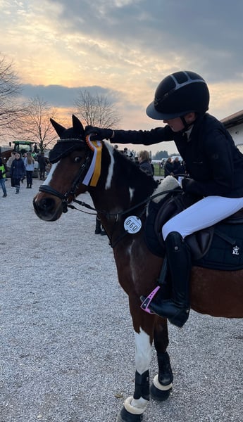 Cookie is an absolute dream pony for us. He has faithfully accompanied our daughter from her early childhood until today, sharing countless wonderful moments in the saddle. Together, they have grown, learned, celebrated successes, and experienced a lot of joy. Since our daughter has now outgrown him, we are reluctantly looking for a new home where he will continue to be loved, supported, and appreciated. Cookie is 20 years old and stands 130 cm at the withers. In daily handling, he is a true treasure – well-behaved, friendly, and completely uncomplicated. Grooming, cuddling, going for walks, or simply spending time together – he enjoys the attention very much. You can really do everything with him. He also proves to be very well-behaved and reliable when hacking out – both alone and in a group with other horses. He remains relaxed, trustworthy, and gives his rider a secure feeling. Whether as a lead horse, relaxed without a saddle, with a halter in the arena, or just happily “hopping” over small jumps – Cookie approaches all these activities patiently and with enthusiasm. He is versatile and always eager to participate. Under the saddle, he is very willing to work and enjoys every task. He loves regular exercise and particularly shows his talent in jumping. He truly blossoms in show jumping competitions. He has competed up to E level in jumping and has also successfully placed in E level Working Equitation. He brings a lot of energy to the jumps and makes riding him a real pleasure. Cookie has a sensitive respiratory system and reacts to dust with coughing. Therefore, he needs a dust-free stable environment and steamed hay. With proper care, he feels comfortable and remains motivated in his work. We wish for him a loving home where his needs are taken into account, and he can continue to be a loyal companion for a child or a young rider. If you are genuinely interested, we look forward to hearing from you. Update: Cookie recently competed successfully with his riding partner in Eicherloh in a 60 cm jumping class. Unfortunately, the riding partner has also outgrown him, as seen in the photo. Cookie will take his prestigious jumping saddle (newly purchased for him), Happy Pony in brown, to his new home.