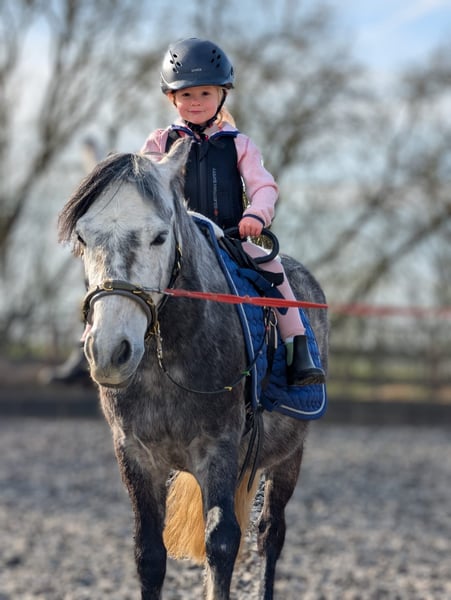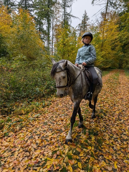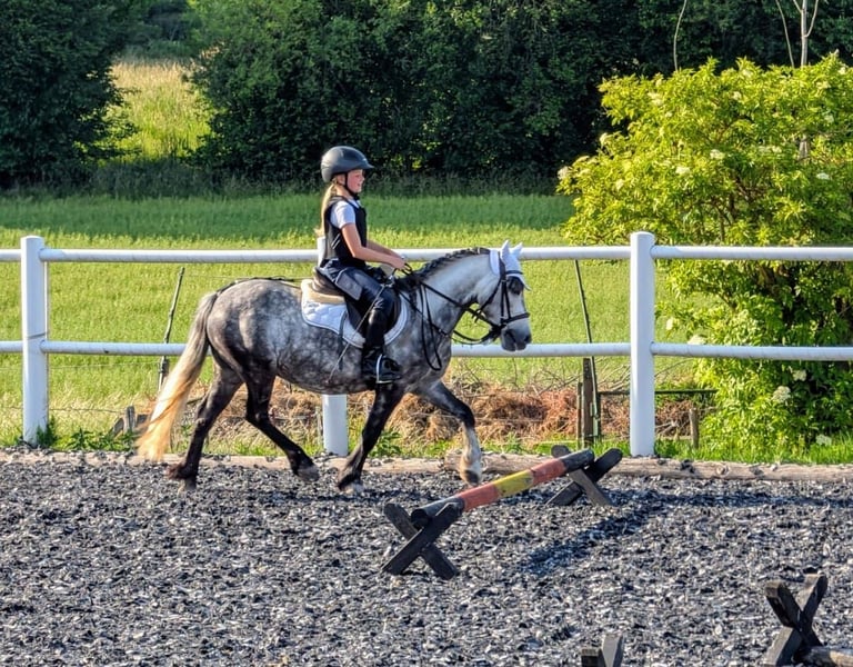 Benji' s Leidenschaft ist die Dressur. Aber auch das Gelände liebt er. Hier ist er mutig und unerschrocken. Er kennt es dort in der Gruppe geritten zu werden. Außerdem geht er alleine brav am Fahrrad und begleitet einen beim Joggen. Kleine Runden meistert er auch alleine geritten. .Auf "brr" steht er sofort. Selbst in brenzligen Situationen. Kleine Baumstämme springt er gerne. Da Benji seinen eigenen Ponykopf hat, sollte das Kind auf dem Platz schon fortgeschrittener sein. Dann läuft er brav im ruhigen Tempo alle Gangarten. Kleine Hindernisse nimmt er locker und ist auch nicht guckig. Meine Tochter ist ihn auch schon kleinere Pakoure geritten. Auch beim Auswärtstraining und auf fremden Plätzen behält Benji seine Nerven. An der Longe können schon die ganz Kleinen reiten. Meine Tochter ist mit 3 Jahren schon auf ihm galoppiert und sogar schon Cavalettis gesprungen. Da ist er geduldig und bleibt eher stehen als das er los rennt. Benji hat auch Spaß an Zirkustricks und macht bei der Freiarbeit eine tolle Figur. Außerdem wurde er 4 Wochen vor der Kutsche gefahren. Auch da hat er gezeigt, was für eine coole Socke er ist. Autos, LKWs, Trecker. Alles kein Problem. Um seine Reiteigenschaften zu verfeinern, war er vor ca. 1 Jahr im Profi - Ponyberitt. Er lässt sich kinderleicht verladen, neues Gelände nimmt er gelassen hin. Benji ist fürs Turnier eingetragen und für 2026 fortgeschrieben. Meine 9jährige Tochter hat im im Dressur und Spring WB vorgestellt und meine 4 jährige Tochter ist ihn im Führzügel geritten. Bei beiden Mädchen war er immer handelbar und brav. Wir geben ihn nur ab, da meine älteste Tochter auf einen Isländer umsteigen möchte. Für Benji suchen wir ein Kind, dass sich mit ihm beschäftigt und mit ihm Abenteuer erleben möchte. Denn er hängt sich sehr an seine Bezugsperson. Aufgrund des Alters, benötigt er noch Ausbildung. Da er gut abdeckt für seine Größe, wäre ein leichter Erwachsener für Korrekturen toll. Benji besitzt alle gängigen Impfungen plus Westnil. Er wurde regelmäßig beim Zahnarzt und beim Osteopathen vorgestellt. Da wir viel Schotterwege haben, ist er 4fach mit Duplos beschlagen. Er kennt es aber auch barhuf zu gehen.