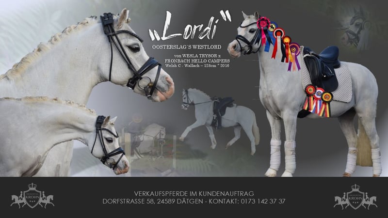 WUNDERSCHÖNER & BEWEGUNGSSRARKER SCHLEIFENSAMMLER & ALLESKÖNNER FÜR DIE KLEINEN - TURNIERE - DRESSUR - SPRINGEN - GELÄNDE - WASSER - AUSRITTE - DIESES PONY EBNET EINEM ALLE WEGE - Kinder, Junioren, Anfänger geeignet! Zum Verkauf steht in Vertretung des Besitzers, dieser beeindruckend schöne, 128 cm große, 9-jährige, hollandische Welsh Schimmel Wallach von WESLA REYSOR x FRONBACH HELLO CAMPERS. Mit "LORDI" ist der Niedlichkeitsfaktor total erreicht, an seiner Box kommt keiner Vorbeo ohne den kleinen "LORDI" anzuhimmeln. Er nutzt das Charmant aus und lässt sich genüßlich mit Streicheleinheiten jederzeit gerne Verwöhnen. "LORDI" wurde bereits mehrfach von Kindern erfolgreich im Turniersport, sowohl in der Dressur , als auch im Springen vorgestellt. Er ist Parcoursicher, kennt bunte Sprunge und auch unterbauten und zieht immer mittig auf den Sprung zu. Ein stehenbleiben oder Umlenken kennt "LORDI" nicht, er zieht voller Motivation über den Sprung uns vermittelt dadurch absolute Sicherheit. In der Dressur ist er auf sicherem A Niveau ausgebildet und lässt sich vorbildlich reiten. Er läuft sicher und leicht in Anlehnung auch ganz ohne Hilfszügel. Bodenarbeit ist "LORDI" ebenfalls bekannt und er ist ein souveräner Partner in jeder Lebenslage. "LORDI" ist immer fröhlich wenn man sich mit Ihm beschäftigt und für jeden Spaß zu haben, ob Kostümwettbewerb, oder mit Fingermalfarbe bemalt zu werden, er genießt alles und freut sich über jede Abwechslung, er ist daher ideal für Kinder. Ein umfangreicher guter röntgologischer und klinischer Tüv liegen vor und seiner Zukunft als Sport- und Famielenpartner steht nichts im Wege. "LORDI" lässt gewiss alle herzen höher schlagen und bereichert jede Familie.
