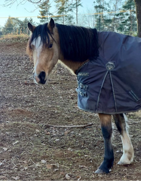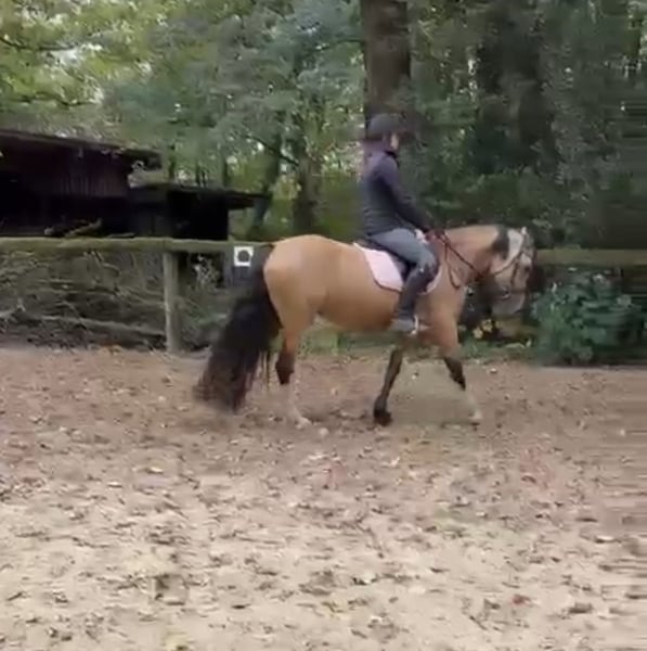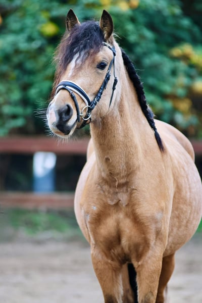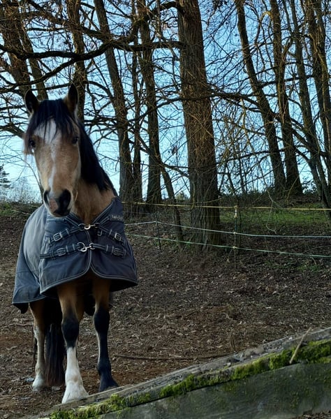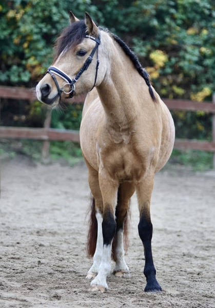 This beautiful young mare Bailey has already been gently and age-appropriately backed. She consistently handles everything as if she were an experienced horse, remaining completely calm and unshaken in any situation. She is a steady and reliable presence. While others may become startled, she simply remains curious and always composed. So far, she has mostly been ridden by children, and she was also very cool and easygoing in the field. With a bit more training and routine, she will surely become an absolute reliable partner and a dream pony. Not only does she boast an absolutely stunning and unique color, but she also has a character of gold that is truly priceless. Bailey is kept in an open stable with other horses. She is friendly and sociable in her herd. For health reasons, we are looking for a 5-star home where she can continue to be challenged and further trained.