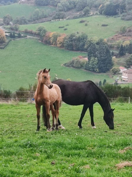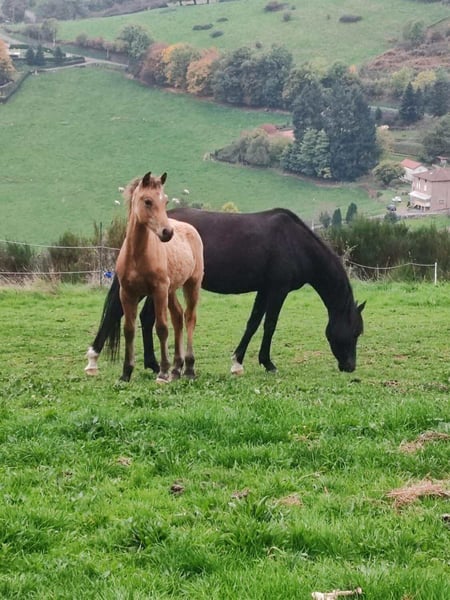 Potro muy elegante, Isabelle, por Ubiwan des Colines y Loubna Redsinner (por Binky). Muy cercano a las personas, manipulado y en tratamiento antiparasitario. Su hermana está visible.