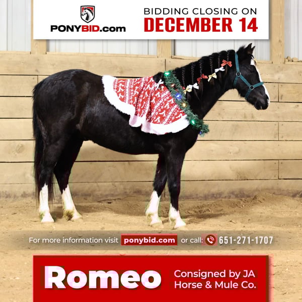 ♦️ In Time for Christmas ♦️ Happening now thru THURSDAY | DECEMBER 14th - Available EXCLUSIVELY on Ponybid's website! For more details and to register visit: www.Ponybid.com CONSIGNOR CONTACT: JA Horse & Mule Co. 651-271-1707 LOCATION: Wykoff, MN BREED: Welsh Type Pony REGISTERED: No COLOR: Black HEIGHT: 13.2 AGE: 6 GENDER: Gelding Romeo - ready to make you fall in love! He is as sharp looking as they come with a true black coat, four white stockings and a stripe down his face. Romeo is a total sweetheart and the perfect step up pony! Romeo is always friendly and easy to catch. He is safe with no buck, kick, rear or bolt. Romeo is handy broke with a good neck rein, stop and reverse. He is brave and always up for a new task. Romeo has spent many hours outside on the trail and crosses anything in his path. Water, logs and bridges. Romeo is a true all-around pony, he has pushed cattle, sorted and been to local fun shows. He is ready to go on and do anything with a great handle and tons of exposure to a variety of different settings. He is the ultimate 4H pony with a lot of ability to go on and win the timed events - he could even do the breakaway! In the arena Romeo has a solid walk, trot and lope. He will step around cute and move off your legs. He crosses the tarp and plays with the big jolly ball. Here is a great pony with a stellar handle for a youth to finish out and make their own. He is the right size and will continue to fill out. Here’s one the kids can absolutely grow and learn with. He’s big enough for an adult to tool around with as well. Romeo is good to bathe and loads in any size trailer. Located in Chatfield, MN ~ come try him today!