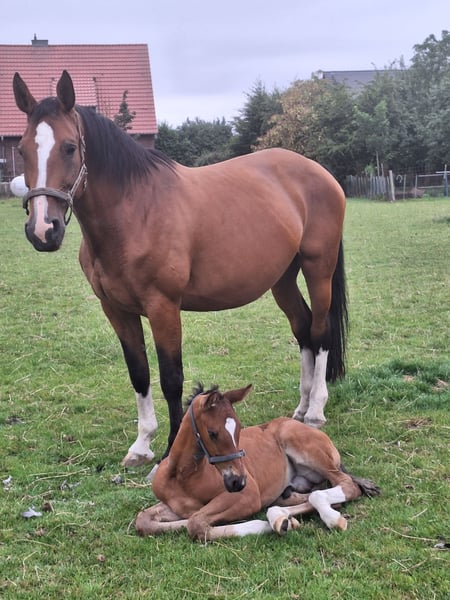 Amigo urodził się 15.06.2025. To energiczny i przytulny ogierek. Mieszka z matką w wolnym wybiegu i na pastwisku w grupie. Zna podstawy opieki nad źrebakiem i jest spokojny podczas czyszczenia kopyt. Matka wygrała konkurs M-Springen, a ojciec w 2025 roku był najlepszym pięcioletnim koniem podczas najbardziej prestiżowego turnieju Europy dla koni skokowych i zdobył złoty medal na Mistrzostwach Niemiec dla 5-latków w skokach. W razie pytań chętnie służę dodatkowymi informacjami. Więcej zdjęć lub filmów można przesłać na życzenie.