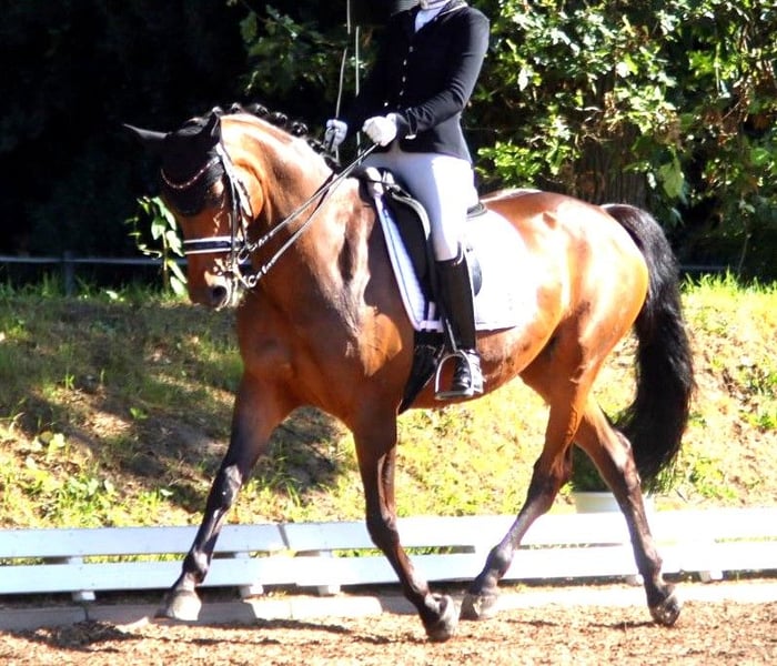 16-year-old mare with solid training seeks new home For sale is our 16-year-old mare with impressive training and experience in the dressage arena. Our "Jolie" has been successfully presented at competitions up to the "M" class and is currently performing at a solid M/S level. She recently won the Hamburg Cup U25 Dressage in Hamburg-Bergstedt. She possesses three above-average gaits with plenty of energy and rhythm. The mare is very well-behaved, people-oriented, and affectionate. She is reliable and balanced both in the field and during pole work. She also enjoys jumping and working on the ground with her human partner. She has placed in A** show jumping competitions. In terms of work ethic, she is always motivated and eager to go. She is particularly well-suited for transitioning from pony to large horse. Health-wise, she is in excellent condition, has never been seriously ill or lame. A current veterinary check can be arranged if interested. If you have any questions or are interested, please feel free to contact us.
