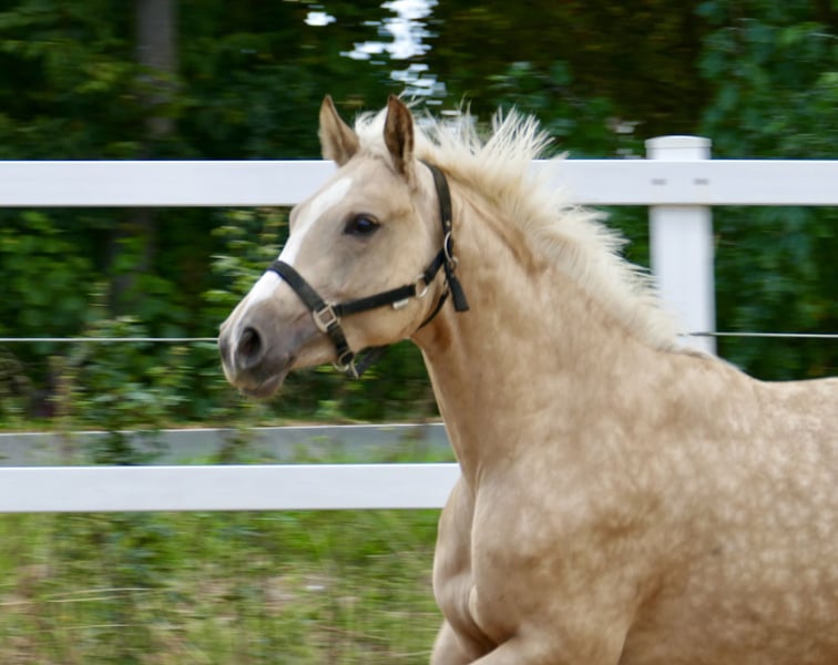 Ismo's Sunrise A - 3 años. Potencial de ensueño en Palomino, altura final aproximadamente 162 cm. Esta joven dama de Ismo x Magic Memphis x Rebel Z III cautiva con su presencia y su excelente potencial de movimiento. Una yegua como pintada, con una herencia sobresaliente, ¡abierta a todas las disciplinas de la equitación! Ismo combina una excelente línea de salto de Ilasso x First Gotthard x Zeus, su color proviene del hermoso Cremello Magic Memphis, Rebel Z III es hermano de Ratina Z, el caballo de campeonato más exitoso en salto.