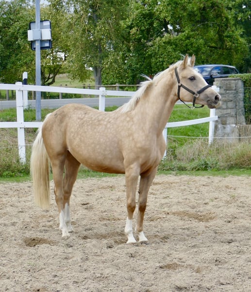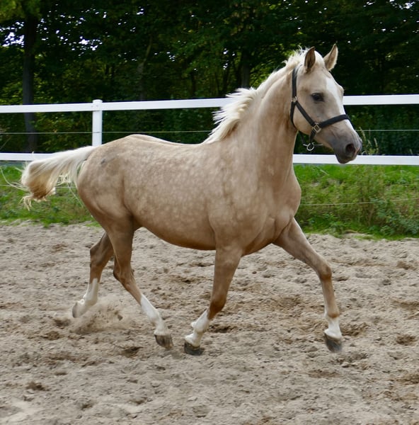Ismo's Sunrise A - 3 ans, pouliche de rêve en Palomino, taille finale environ 162 cm ! Cette jeune dame, fille de Ismo x Magic Memphis x Rebel Z III, enchante par son charisme et son excellent potentiel de mouvement. Une jument comme peinte, exceptionnellement douée, ouverte à toutes les disciplines équestres ! Ismo réunit une lignée de saut d'obstacles de premier ordre avec Ilasso x First Gotthard x Zeus, sa couleur provient de son père Cremello Magic Memphis, et Rebel Z III est le plein frère de Ratina Z, qui est le cheval de championnat le plus réussi en saut d'obstacles.