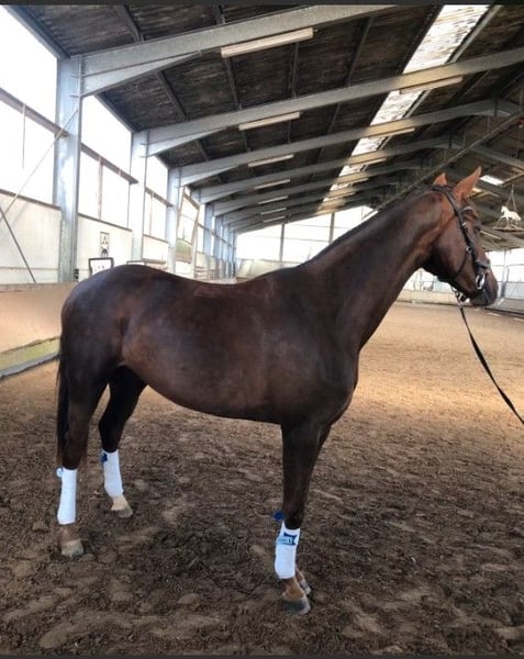 Dreijährige Dunkelfuchs Stute bestens gezogen direkt vom Züchter. Sie ist von Flashdancer aus einer Licotus, Rubinstein Mutter. Alle Nachkommen aus dieser Mutter gehen erfolgreich im Dressursport. Sie ist angeritten und macht sich sehr gut sie ist leicht händelbar nicht schreckhaft und hat ein liebes Wesen . Geht ins Gelände und auf die Weide ist verträglich mit anderen Pferden. Stockmass 173 Sie wird nur in beste Hände abgegeben .