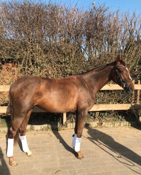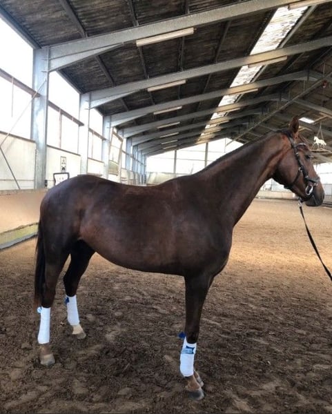 Jumente bai three ans, de couleur baie foncée, issue directement de l’éleveur. Elle est par Flashdancer, de mère Licotus, Rubinstein. Tous les descendants de cette mère réussissent en dressage. Elle a été montée et se montre très prometteuse, elle est facile à manipuler, non peureuse et possède un tempérament doux. Elle sort en balade et en pâture, et est compatible avec d’autres chevaux. Taille au garrot : 1,73 m. Elle sera confiée uniquement à des propriétaires expérimentés et de confiance.