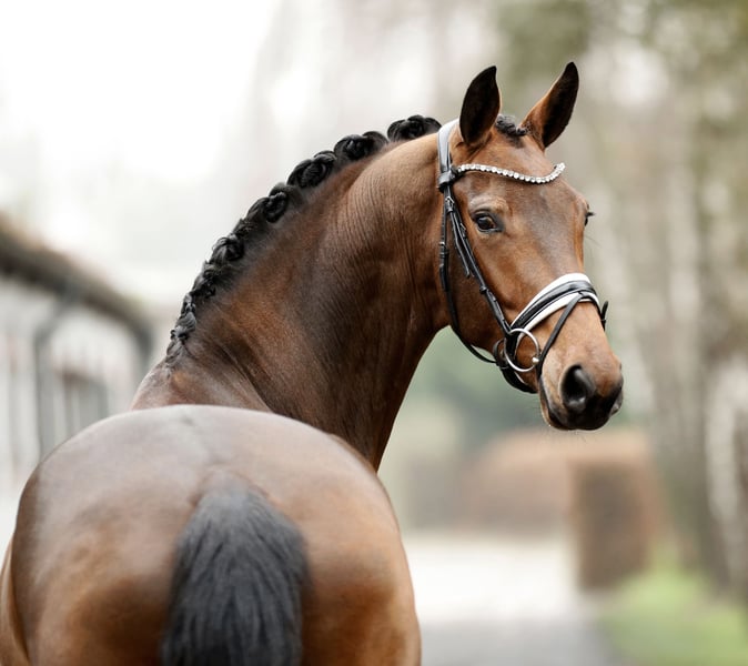 Splendida cavalla da dressage compatta, con un profilo laterale moderno e mascolino e una tipologia armoniosa e attuale. Educata in modo naturale, delicato e corretto, proveniente da un allevamento eccellente con le migliori condizioni per un futuro sportivo di successo. Questo giovane cavallo offre le migliori premesse, con una qualità omogenea e molto buona, un atteggiamento facilmente sviluppabile e una capacità di cavalcata elegante e senza sforzo. Nel suo insieme, si tratta di un puledro di grande valore, con un passato esclusivamente positivo, un fondamento corretto e un carattere estremamente affabile. Certificato di idoneità valido – spedizione su richiesta.