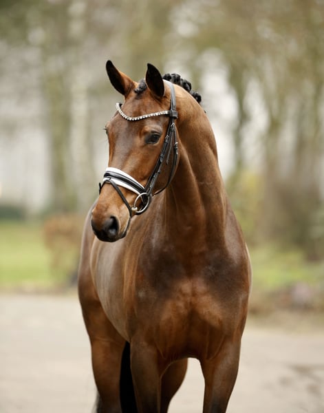 Beautifully conformed, compact dressage mare with a modern, masculine side profile and a harmonious, contemporary type. Reared with care and correctness, from an absolutely excellent breeding program with optimal conditions for a promising, athletic future — this young horse offers excellent potential with consistent, high-quality conformation, a trainable attitude, and effortless, graceful rideability. Overall, a special, high-quality young prospect with only positive history, a solid foundation, and a very lovable character. Good inspection — shipping available upon request.