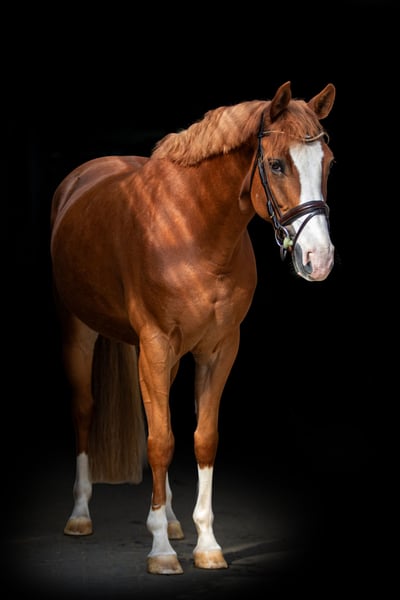 6-year-old, ambidextrous, stunning chestnut mare with great basic gaits and striking markings For sale is our stunning Westphalian mare Grace d'Amour S, Galant de Semilly x Bugatti, from our own breeding. I am a master of equine management specializing in classical riding and compete up to the advanced classes. At our family-run facility, we have been breeding successful sport and leisure horses with much love and experience for decades. One of my passions is breaking in and presenting our young horses at competitions. Grace is an exceptionally beautiful chestnut mare with a very pleasing height of 164 cm. This makes her suitable not only for adults but also for larger children. Grace has no vices, fears, or quirks. She does not buck or rear. On the contrary, for her age, she can be described as calm and strong-minded. She always wants to please, whether under saddle or in handling. Grace possesses three good basic gaits and shows herself to be eager and willing to learn under saddle. In the 1.5 years she has been under my saddle, I have established absolutely correct basics in dressage and jumping. Easy to handle, she could immediately start in the E and A classes, even with a young or less experienced rider. She was able to prove her abilities at her first competition, where she not only shone with her stylish appearance but also impressed the judges with her skills. She placed immediately in her first suitability test. On the competition and warm-up grounds, she behaves exemplary, just as she does at home, presenting herself confidently and fearlessly. In perfect health (has never been sick), brave and willing to learn, all paths are open to her. I wish for her an ambitious rider who will further educate her and present her at competitions. Her ambidextrous nature also makes her interesting for eventing. Of course, she would also make a great companion in leisure activities. You can cuddle with her and spend a lot of time together. She truly gallops into everyone’s hearts. With her nice character and balanced nature, I could also imagine a mother-child combination, where they could further promote her and perhaps present her at competitions, or simply invest a lot of time and love in her, go for rides, and have fun. Healthy and expressive with very good jumping ability, her foundation is laid, and one can decide which further path to take with her. We are so convinced of her abilities, conformation, and appearance that we even bred a foal with her last year. With her good pedigree, she is also perfectly suited for breeding. Grace is a beautiful horse with an honest character and a heart of gold. Feel free to get to know Grace and our facility personally and contact me by phone or email. A trial ride is, of course, possible by arrangement and with serious interest. To prevent riding tourism, we charge 50 euros for the trial ride.