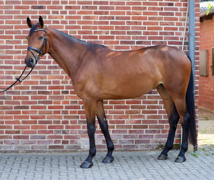 This elegant daughter of Crime is Collin, out of a mother by Quinta Real, combines modern type expression, talent, and attitude in a way that even experienced horse people take notice. Long-lined, blood-typed, and with that certain something, Candelight presents herself as a true sport horse: always attentive, always present – yet fine to ride. Anyone who has worked with her knows what it means to get on a horse that "cooperates." Her basic gaits are functional and pleasant to sit – ideal for further training and for riders who value rideability and clarity in riding. When jumping, she shows what she is capable of: alert, with lightning-fast front leg technique, clean bascule, and impressive take-off. She jumps with awareness and ambition, but without overdoing it – a horse that thinks along in the course. No wonder she has already decorated herself with victories and placements in A-class show jumping competitions at the age of four. She achieved two more victories with scores of 8.5 and 8.6 in her course debut this year. But Candelight is more than just a jumping talent: with her eager gallop, secure manner, and brave heart, she also offers enormous potential for eventing. Those looking for a modern, performance-ready horse that feels just as comfortable in the field as in the show jumping arena should take a look at her. This is no coincidence, as this striking mare comes from the increasingly prominent son of Cornet Obolensky, Crime is Collin. Her mother, Quinta Loona, has competed up to 1.50 m with Kendra Claricia Brinkop. Grandmother Loona produced many other sport horses, including C-Loona NRW, who was successful up to 1.60 m under Katharina von Essen. A horse for athletes with foresight. And for those who recognize quality before she stands in the spotlight everywhere.
