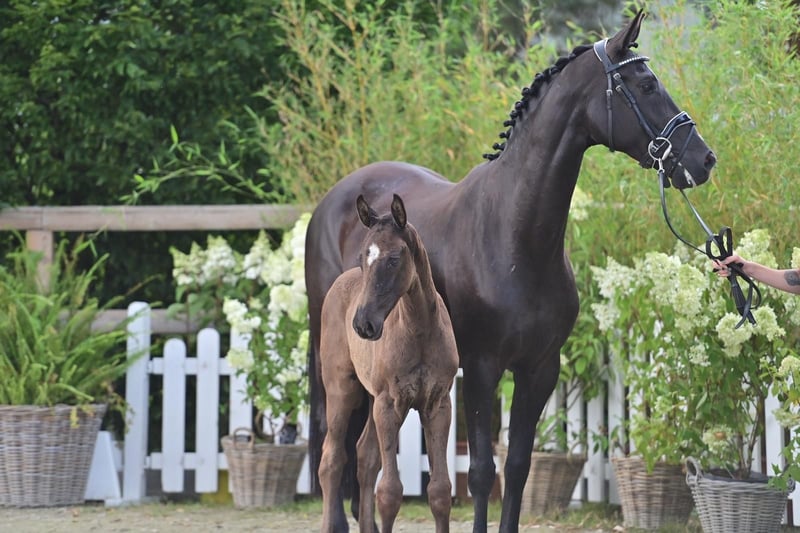 For sale is an elegant and expressive 7-year-old dark bay mare (glossy bay) named Fame and Glory, born on May 19, 2019. She impresses with her highly interesting pedigree: Her sire is the Oldenburg premium stallion Follow Him’s Schönweide, and her dam is a state premium mare, San Amore HB. Several licensed stallions and premium mares have emerged from this high-performance dam line. Fame and Glory herself produced a very typey, correct, and premium colt by the stallion So Perfect last year. With a height of approximately 16.1 hh, she presents an imposing presence. She captivates with: - a wonderful charisma - expressive, elastic movements - excellent basic gaits (walk, trot, and canter) Training status: - Dressage class A, competition-ready - already has competition experience - currently under professional training up to S-level with a trainer Fame and Glory is a talented, motivated mare with great potential for her further sporting career as well as for breeding. Serious inquiries are welcome, and we look forward to hearing from you.