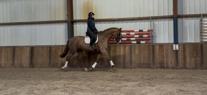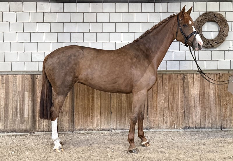 Unkomplizierte Dressurstute (2018) – viel Substanz und angenehmes Wesen Schöne, korrekt gebaute Stute aus dem Jahr 2018, mit einer Stockmaß von ca. 1,70 m und viel Substanz. Abstammung: Vater: Zoom (Zack x Don Schufro) Mutter: Romanov Blue Hors x Weltmeyer II Diese Stute zeichnet sich durch ihr sehr gelassenes und unkompliziertes Wesen aus. Sie ist weder sensibel noch schreckhaft, was sie im Umgang und unter dem Sattel angenehm macht. Sie hat bereits mehrere Fohlen bekommen und wird derzeit im Dressurtraining gearbeitet. Dank ihrer angenehmen Einstellung und interessanten Blutführung ist sie sowohl für den Sport als auch für die Zucht geeignet. Merkmale: • Stute | 2018 • ca. 1,70 m • viel Substanz • ehrliches und zuverlässiges Wesen • nicht schreckhaft oder sensibel • hat Fohlen bekommen • aktuell im Dressurtraining 📍 Weitere Informationen, Fotos und Videos auf Anfrage. Oud Gastel, NL