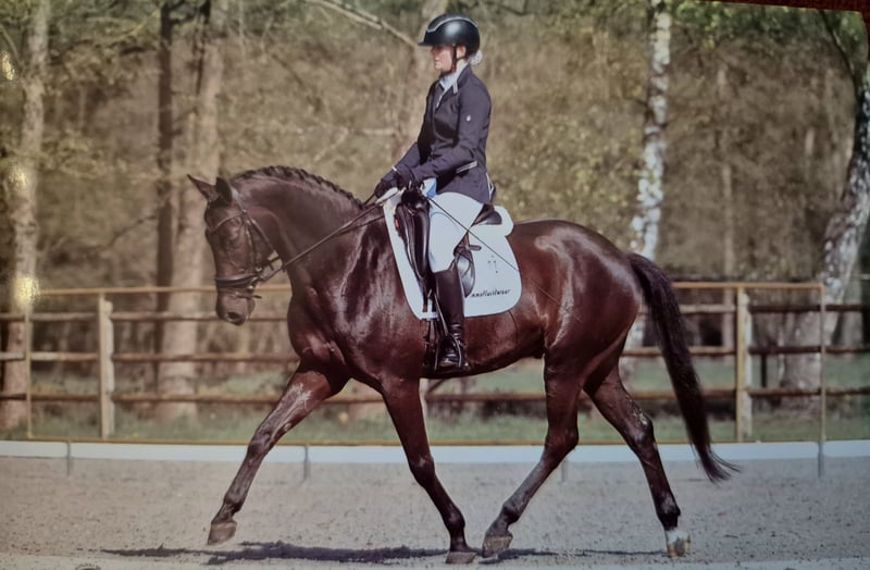 Almost Black is a well-behaved and willing dressage horse foaled in 2015, standing approximately 16.1 hh. He is easy to handle both on the ground and under saddle, with extensive competition experience. He loads easily and travels quietly, including at the vet and farrier. He is familiar with lateral movements such as leg-yields, shoulder-in, travers, and half-pass, as well as counter canter, simple flying changes, and a green flying change. Pedigree: All al Once (by Ampere) x Kostolany. In December 2022, he was clinically and radiographically approved, including the back and neck. Re-approval costs are the buyer’s responsibility. Reason for sale: the owner has limited time to ride.