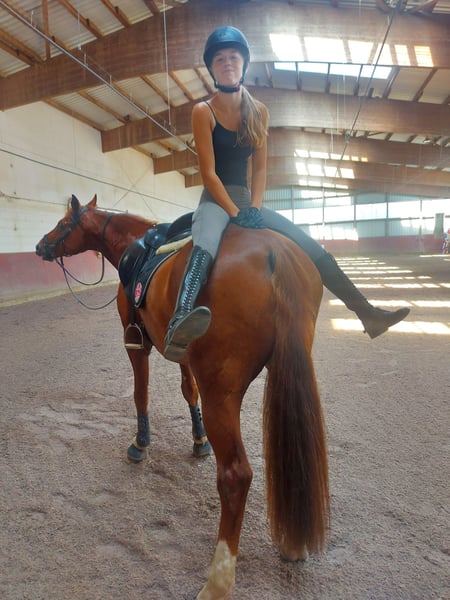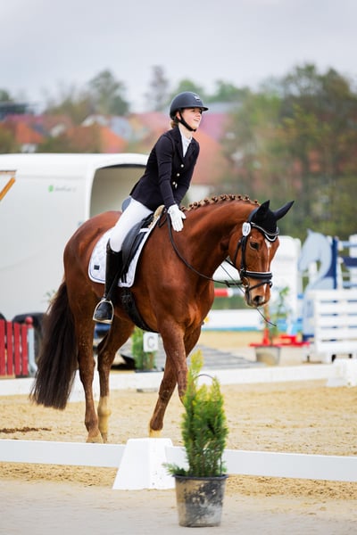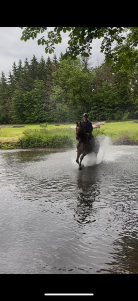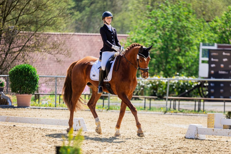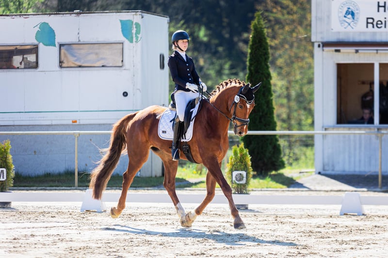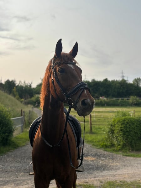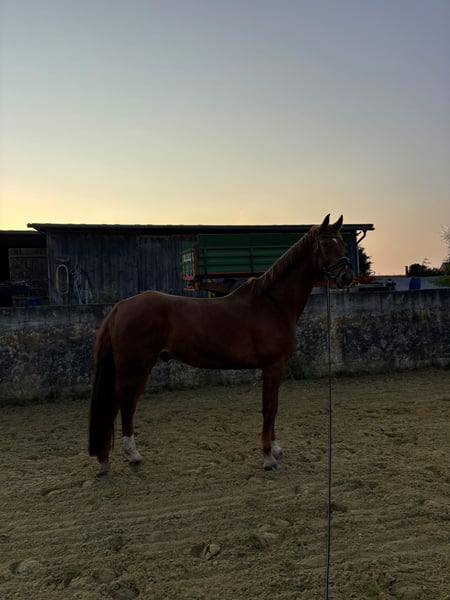 We are offering our 12-year-old chestnut gelding Paddy for sale. He is currently being regularly ridden by my daughter (19 years old) and is also being presented at competitions (L-level dressage). So far, he has placed several times at A-level, and we hope that an L placement will come soon as well ;-) He is a real eye-catcher and a ray of sunshine. He has also been trained with a double bridle. Our daughter is going to change her career, so unfortunately, Paddy will not get the attention he deserves in the future. Therefore, we have made the difficult decision to sell him, but only to the very best hands with a 5-star home. Paddy has been a part of our family since he was 3 years old and was taken directly from the breeder. He has been gently and patiently trained by us and has enjoyed regular turnout with other horses. We place great importance on varied training. He regularly goes out on trails, even alone, is lunged, and is also gymnasticized with poles and small jumps. He is familiar with cross-country training involving jumps and water. He used to jump up to A-level in show jumping. However, this is not his favorite discipline and he does not enjoy it much. Therefore, he is not being sold as a show jumping horse. Since Paddy is regularly transported for training, he loads very well, stands alone in the trailer, and is also easy to groom at the trailer. He has an excellent character, is simply sweet to handle, honest, and cuddly. He follows us around like a dog. He is also compatible with other horses. Paddy is healthy and has had no significant injuries so far. He is fully shod. However, he does need a strong, consistent, and well-trained rider who can show him that it’s time to work. Then he will do everything. He is definitely not suitable for beginners or weak riders. He has very expressive basic gaits and can be a bit difficult to sit to in the trot for some. We could also see Paddy as a vaulting horse, as he goes well on the lunge line and responds excellently to voice commands. If you are genuinely interested, we would be happy to talk on the phone, and we can send additional videos. It is very important to us that Paddy finds a wonderful home where he has time spent with him, other companions as friends, and can enjoy daily turnout. Therefore, the price is secondary, but we do not want to give him away!
