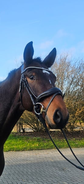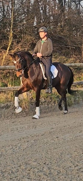 Wir bieten hier einen sympathischen Wallach mit hervorragenden Grundgangarten an. Aufgewachsen ist er in einer kleinen Gruppe bei uns auf dem Hof. Unter dem Sattel ist er seit ca einem halben Jahr. Er ist angenehm im Umgang und begeistert seinen Reiter mit seinem natürlichen Grundschwung und Ehrgeiz. Ein hoffnungsvolles Nachwuchspferd für den Dressursport.