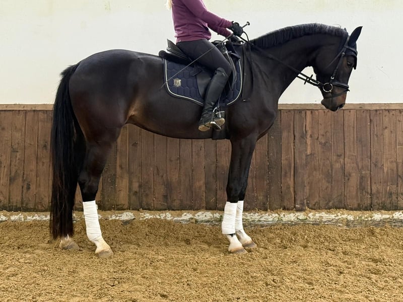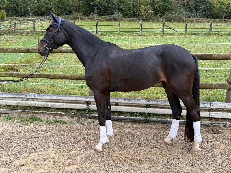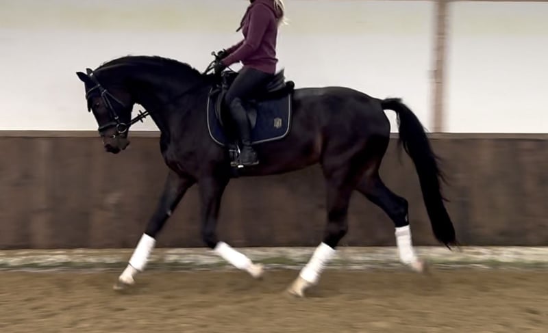 For sale is a beautiful gelding by Flavis x Belconi in a dark brown coat with four white legs. This talented young man is excellently suited for dressage and already shows promising potential in his training. His movements are smooth and expansive, making him an ideal partner for ambitious riders. His willingness to perform is evident in his pleasant forwardness, where he is responsive to both leg and hand aids. He is well-mannered, brave, and has a strong character. He is now looking for a new home where he can be both challenged and supported. Due to his young age, he is not suitable for complete beginners. If you are interested or need further information, please feel free to contact me.