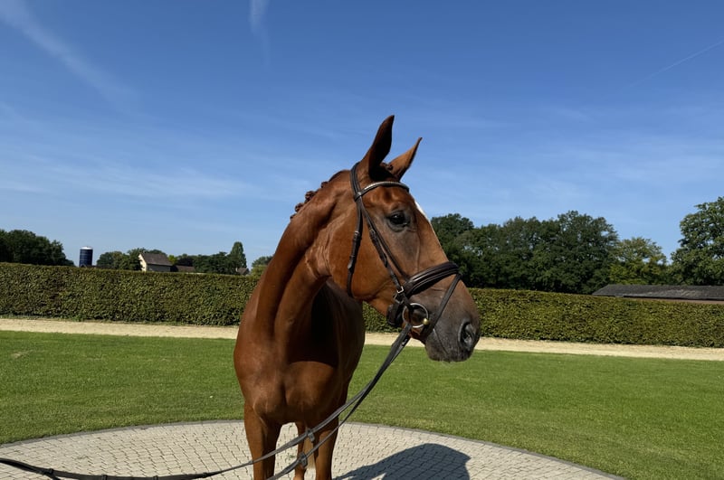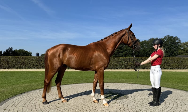 This three-year-old son of First Deal impresses with his impeccable character and very good working attitude. Fandango is at the very beginning of his career as a riding horse, broken in at the Westphalian Horse Center, he impresses daily with his high rideability values. Equipped with three good basic gaits, nothing stands in the way of his career as a sport and leisure partner. After just two months under saddle, he takes on every new task with flying colors: whether in the arena, on the arena or in the field, he is always calm and focused, whether with other horses or alone. Fandango comes from an internationally successful dam line with placings up to advanced level in dressage and show jumping. All doors are open to this easy to ride youngster!
