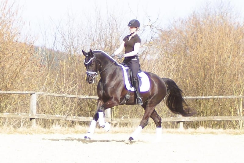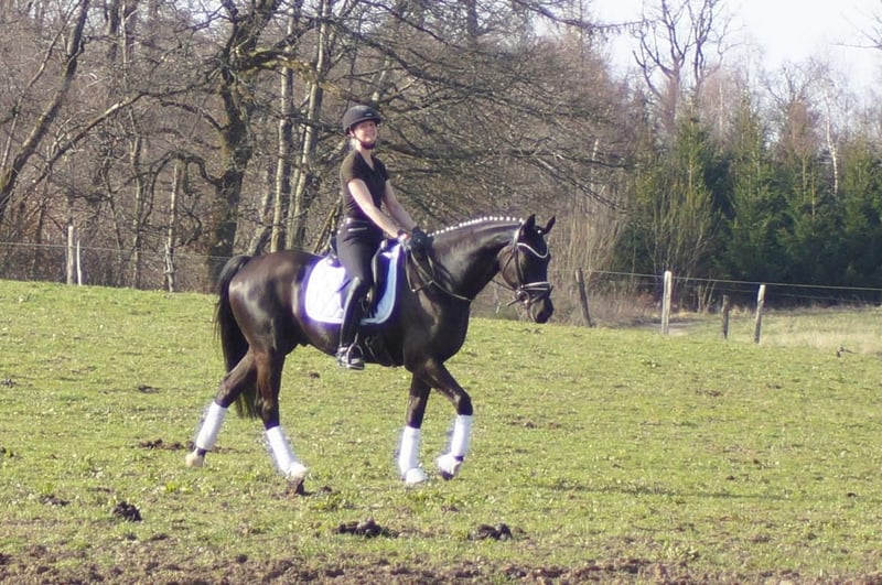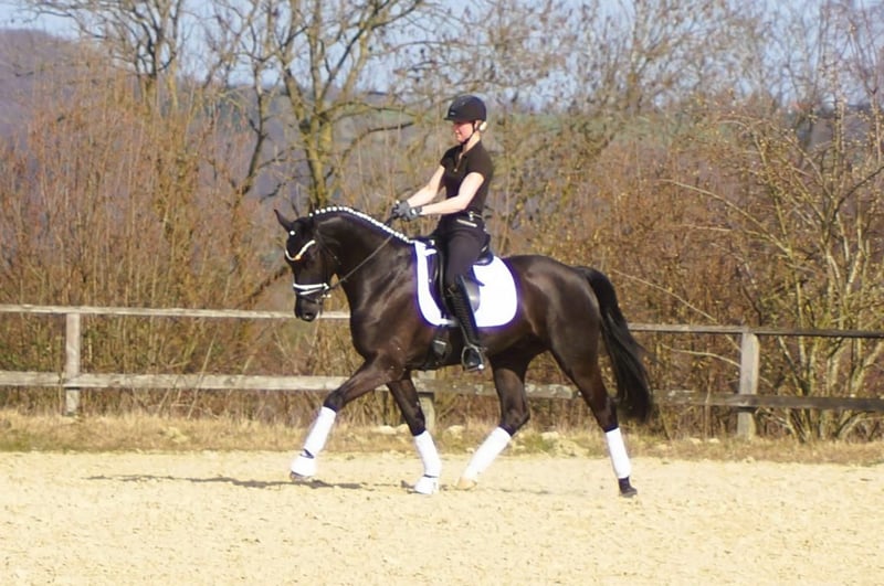 Fiorello is an exceptionally handsome and charming dressage horse, exhibiting a level of rideability and willingness to work that is quite rare. He combines the gentle nature and good contact of the Fürstenball son Finest with the courage and performance drive of Arpeggio. In his third generation, his dam is the mare Danny Doreen, who has already produced a licensed stallion with Let de Lember. She contributes the deep hock angulation necessary for good balance and power development. His three basic gaits are equally well-developed. His walk is very expressive with a secure overstep. In trot, he has a strong hindleg with excellent weight-bearing and good shoulder freedom. Thanks to his excellent conformation, he is easy to collect, which is especially beneficial for less experienced riders. The same applies to his canter: he demonstrates a very uphill canter, always attentive to the rider. Overall, Fiorello can be recommended to anyone. If someone is looking for a relatively young horse, he is the perfect choice. With him, there’s no need to get everything right immediately; he offers many opportunities and always maintains a cheerful attitude. A TÜV report without findings is available, valid until February 2026.