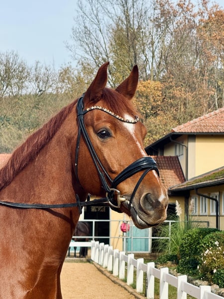 Valdancio is a modern-built chestnut gelding. Turning six this year, he has all doors open to him. He is characterized by very good rideability once he has won his rider’s heart. Initially, he may test boundaries due to his age, but his playful ideas often bring a smile. Besides dressage work (his canter is particularly impressive), he is also familiar with free jumping, groundwork, trail riding, and hacks. I am looking for an ambitious rider who can become his number one. Accessories can be included upon request.