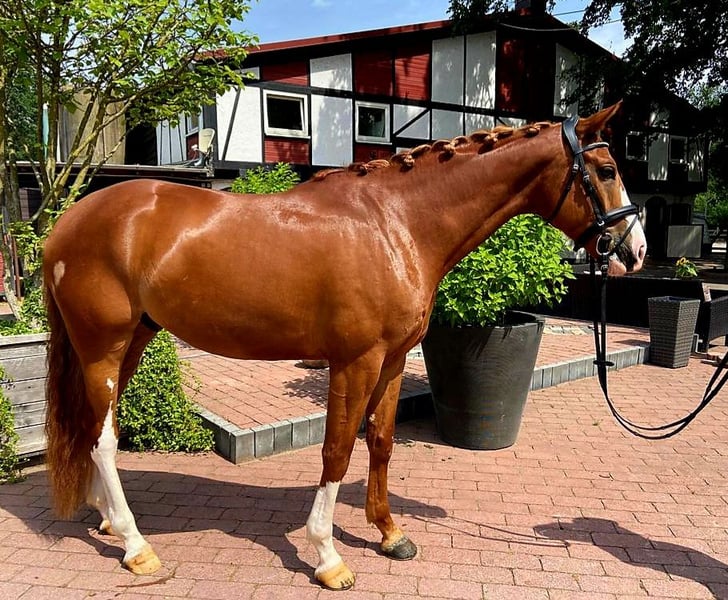 5yo capital Westphalian chestnut gelding by Benicio x Fürst Heinrich, 1.69 stm.*, brilliant with his habitus, very gently broken in late, equipped with three excellent basic gaits, which make him a special quality horse for the big sport, shows the best character.