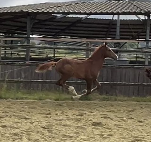 Jackson MK was born on April 2, 2025, and he wants to grow not only physically tall! He is not only extremely handsome but also stands on an incredibly harmonious and solid foundation. He learns very quickly, is curious, and approachable. His mother is a tall mare with a height of 1.76m and a lot of talent for jumping. He wants to follow in her footsteps.