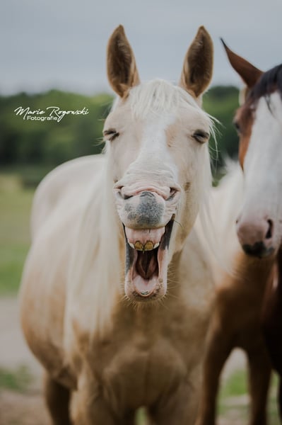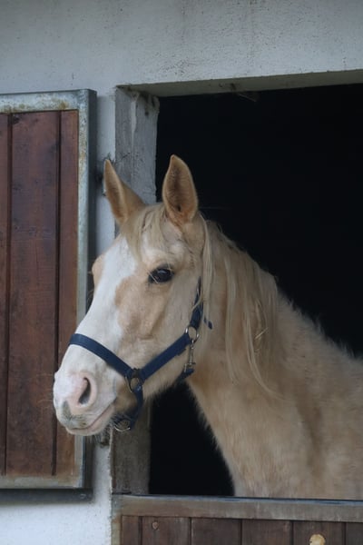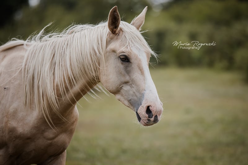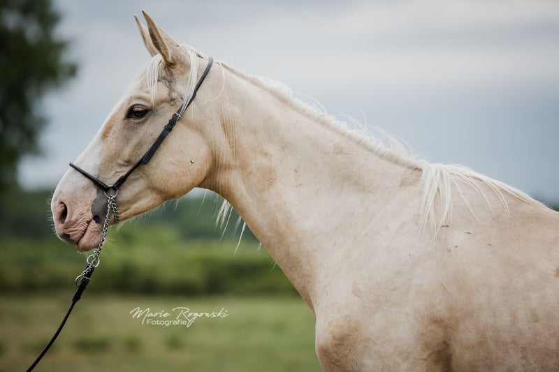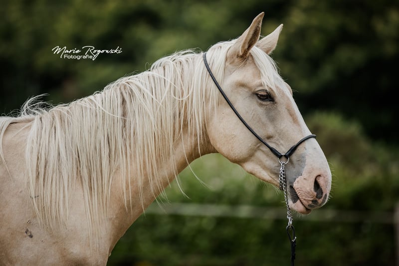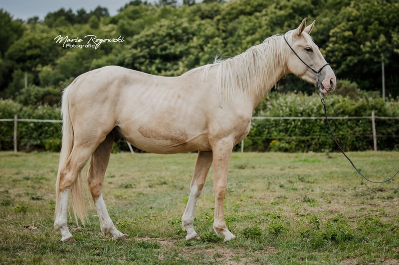 LETTER OF GOLD Z est le parfait mélange de son célèbre père pur-sang LETTER OF MARQUE xx (USA) - bai foncé frame-overo - et de la jument d'élevage Westphalienne cremello éprouvée MACADAMIA GF, qui ne peut jamais renier sa proche parenté avec WHITE WINE GF et WEISSGOLD GF et qui a été primée dès son jeune âge. La descendance de LETTER OF MARQUE xx a déjà enthousiasmé aux États-Unis avant de s'imposer en Allemagne et en Europe depuis 2013 chez les pur-sang, les warmbloods et les anglo-arabes (dernière image). Il a produit deux fils approuvés, Trakehner et Zangersheide. Le grand-père maternel WIN THE GOLD a marqué une grande génération autour du haras Falkenhorst avant de partir pour l'Australie, où il continue d'enrichir le monde des warmbloods éclaircis. Le jeune étalon palomino montre, par ses marques blanches, son héritage DW20, que nous entretenons chez de nombreux warmbloods. Selon le test génétique, il n'a pas hérité du gène OLWS de son père. Sa grande envergure et son amplitude de mouvement font d'abord penser au dressage. Grâce à son héritage pur-sang et à un import américain montré en concours complet, de nombreux chemins s'ouvrent à lui. Une croissance en tant qu'étalon peut être envisagée positivement. Notre objectif d'élevage est de produire des chevaux de loisir polyvalents pour le cavalier terre-à-terre, qui, en tant que bon cavalier de l'école classique, favorise et gymnastique les animaux en harmonie avec leur développement. Les poulains grandissent en groupes mixtes sur de grands pâturages en extérieur toute l'année. Le sol plutôt pauvre renforce les jeunes, qui sont nourris de manière appropriée avec un accès libre à du foin et de la paille bio, et des minéraux adaptés à leurs besoins énergétiques. Vermifugés régulièrement (ZSE) et les sabots maintenus en forme par un orthopédiste équin. Le troupeau est géré de manière holistique et principalement avec des méthodes naturopathiques. À partir de la deuxième année de vie, les jeunes rejoignent le groupe "Wilde Kerle" avec un vieil étalon qui leur explique la vie. Ils ont un contact quotidien avec nous, les humains, et s'en réjouissent. Ils connaissent déjà beaucoup de choses du quotidien, y compris des parcours au sol, le round-pen ou le solarium. Cependant, nous devons les céder - uniquement aux meilleures mains. Passeport Zangersheide "section principale" (Hauptstammbuch) et enregistrement IFCE (Facteur Selle Français). Tout le reste dans une conversation personnelle. L'animal peut rester en élevage à des conditions très avantageuses, avec possibilité de castration sur demande. Le propriétaire a à sa disposition nos mobil-homes au haras pour des visites régulières.