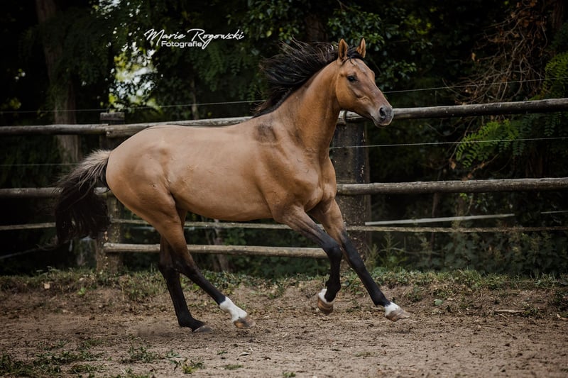 Zangersheide stallion in bay dun | born 2018 | 163 cm Approved stallion for AES, Zangersheide Genetics: E/e A/a D/n Tested free of ECVM, PSSM2, MFM, RER (CAG Panel) Fabelkönig is a stallion with great presence and impeccable behaviour. He was broken in in 2024 and shows enthusiasm and great potential. Since then, he has not been able to be worked on further due to time constraints, but would be ready to start training immediately. Fabelkönig is perhaps the only licensed warmblood stallion that passes on the dun colour. He got his colour from his dam Funny Girl, also a bay dun mare who can be viewed at our stud. Three other offspring from the same dam can also be viewed at our stud. At the renowned Trakehner stud farm in Merzdorf, the licensed Norwegian Fjord horse stallion Emil *1972 covered the English thoroughbred mare Feinsliebchen, who is registered in the main stud book of German Trakehner breeding. The Trakehner Association and later the ZfDP recognised this and the filly qualified for the main stud book. This is Funny Girl's grandmother. This means that Fabelkönig now has foreign blood in the 4th generation and his foals are therefore eligible for registration with many renowned sports associations. Fabelkönig's sire is the Spree stallion Fürst Wilhelm, carrying every big name there is when it comes to dressage lineages, and his sporting career speaks for itself.
