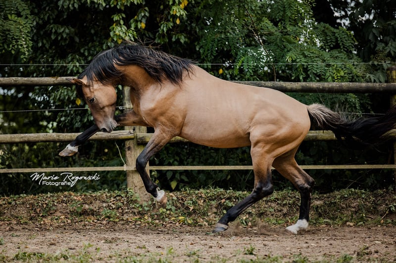 Zangersheidehengst in Braunfalb (Bay Dun) | geb. 2018 | 163 cm bewerteter, gekörter Hengst für AES, Zangersheide Genetik: E/e A/a D/n Getestet frei von ECVM, PSSM2, MFM, RER (CAG Panel) Fabelkönig ist ein Hengst mit toller Präsenz und trotzdem einwandfreiem Benehmen. Er wurde 2024 eingeritten und zeigt sich eifrig und mit viel Potenzial. Seitdem konnte er aus zeitlichen Gründen nicht weiter gearbeitet werden, wäre aber sofort Startklar fürs Training. Fabelkönig ist der vielleicht einzige gekörte Warmbluthengst der die Falbfarbe vererbt. Die Farbe hat er von seiner Mutter Funny Girl, einer ebenfalls Braunfalb Stute die bei uns besichtigt werden kann. Aus der selben Mutter sind auch 3 weitere Nachkommen bei uns auf dem Hof zu besichtigen. Im renommierten Trakehner Gestüt Merzdorf deckte der gekörte norwegische Fjordpferde Hengst Emil *1972 die im Hauptstammbuch der deutschen Trakehnerzucht eingetragene Englische Vollblutstute Feinsliebchen. Trakehnerverband und später ZfDP erkannten dies an und das Stutfohlen qualifizierte sich für das Hauptstutbuch. Das ist die Großmutter von Funny Girl. Somit ist bei Fabelkönig das Fremdblut inzwischen in der 4. Generation und seine Fohlen sind somit bei vielen renomierten Sportverbänden zulassungsfähig. Fabelkönigs Vater ist der Spree Hengst Fürst Wilhelm bringt alles was im Dressursport Rang und Namen hat und auch seine sportliche Karriere spricht für sich.
