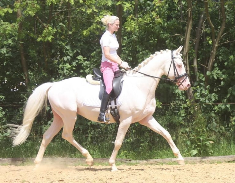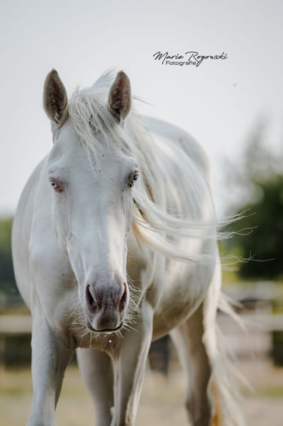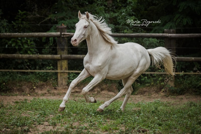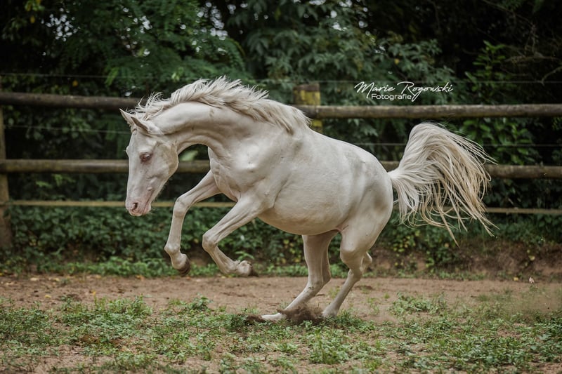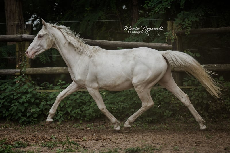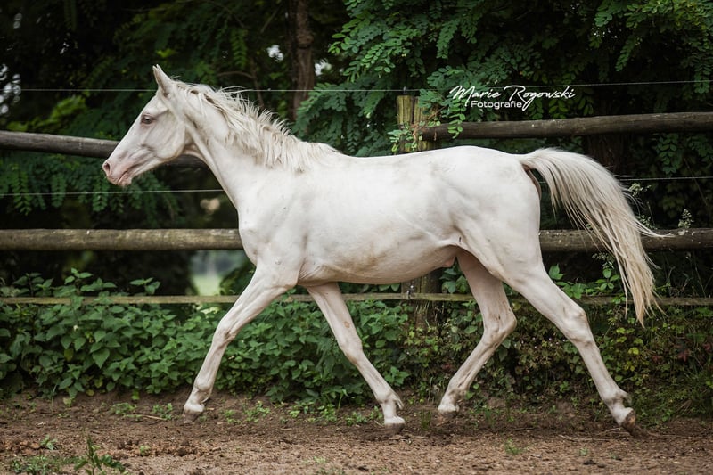DOUBLE CREAM Z ha heredado lo mejor de sus dos padres cremello, el semental premium DON CREAM GF y WHIPPED CREAM GF. Como un ser de cuento de hadas, flota como un unicornio etéreo hacia el atardecer... o también le gusta ensuciarse, ya que puede vivir al aire libre 24/7/365 con sus compañeros en un grupo de yeguas de diferentes edades. Es la última cría de la icónica criadora de caballos de color Gwendolyn Gregorio y nació con nosotros solo después de su fallecimiento. El resultado de un desarrollo de cría desde 1978 con un plan y objetivo claros. El semental premium DON CREAM GF (última imagen) se destaca por su árbol genealógico artístico (DREAM OF GOLD - MASCARPONE GF), que representa en todos los aspectos. Su descendencia en Inglaterra es impresionante. En nuestra cría, siempre ha producido calidad. WHIPPED CREAM GF (WIN THE GOLD - MALTESER GOLD) ya tiene crías que son yeguas de cría exitosas en Europa, emparejándose con éxito en cualquier disciplina deseada. Es apta para el libro de cría principal de Westfalia, Renania, Oldenburg, DSP y ZSAA sangre noble alemana. El padre materno WIN THE GOLD ha influido en una gran generación alrededor de la cría Falkenhorst y luego se trasladó a Australia, donde continúa enriqueciendo el mundo del caballo de sangre caliente. Nuestro objetivo de cría son caballos de ocio versátiles para el propietario de caballos tradicional, que como buen jinete fomenta y gimnasia a los animales en armonía con su desarrollo según la enseñanza clásica. Los potros crecen en grupos mixtos en grandes praderas al aire libre durante todo el año. El suelo más bien árido fortalece a los jóvenes, que reciben alimentación complementaria adecuada, con acceso libre a heno y paja orgánicos y minerales, adaptados a sus necesidades energéticas. Se desparacitan regularmente (ZSE) y se mantienen los pies en forma con ortopedia equina. La cría se maneja de manera holística y prioritariamente con medicina natural. Tienen contacto diario con nosotros, los humanos, y disfrutan de ello. Ya conocen muchas cosas de la vida cotidiana, incluso en el recorrido de suelo, el round pen o bajo el solárium. Sin embargo, debemos dejarlos ir, solo a las mejores manos. Pasaporte Zangersheide "sección principal" (libro de cría principal) y registro IFCE (Facteur Selle Francais). Todo lo demás en una conversación personal. El animal puede quedarse para su crianza en condiciones muy favorables. El propietario tiene a su disposición nuestras casas móviles en la cría para visitas regulares.