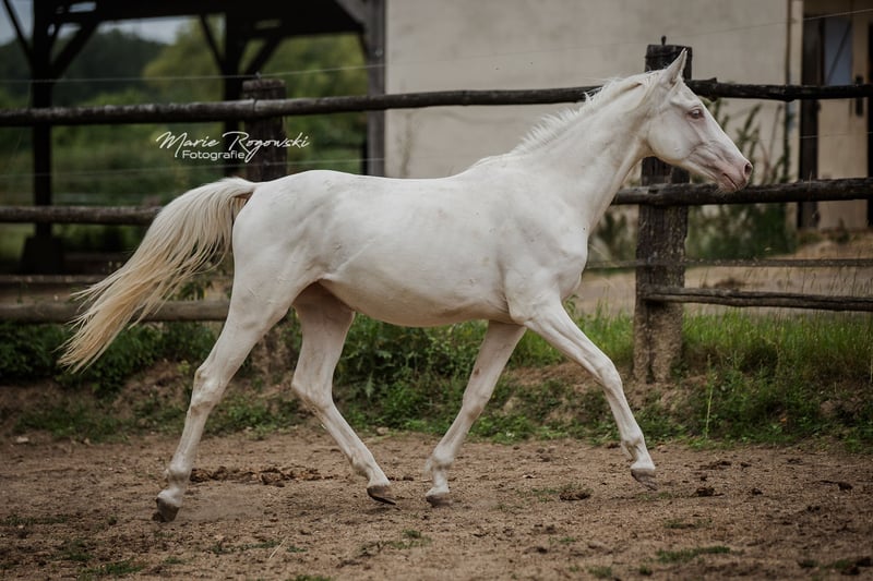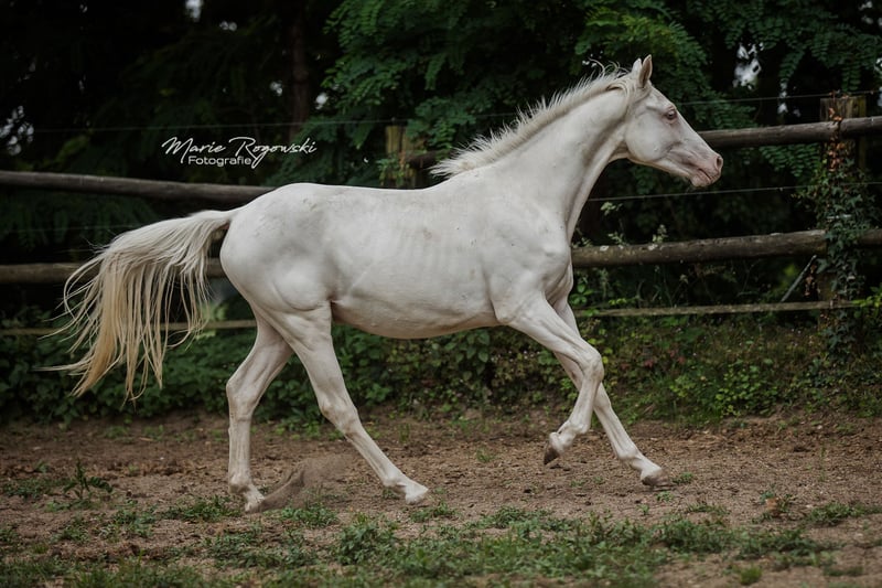 DOUBLE CREAM Z is a young, people-friendly mare with a clear head and expressive appearance. She is growing up in a mixed group of young mares and is familiar with everyday contact with people. She is curious, attentive and eager to move. She is familiar with the first elements of handling, but is definitely not yet ready to be broken in straight away. Sire: DON CREAM GF - premium stallion with a proven pedigree (DREAM OF GOLD - MASCARPONE GF), produces high-quality, versatile offspring Dam: WHIPPED CREAM GF - cremello broodmare with multiple successful offspring in European colour breeding Dam's sire: WIN THE GOLD - important sire in lightened warmblood breeding, with a dressage and jumping background
