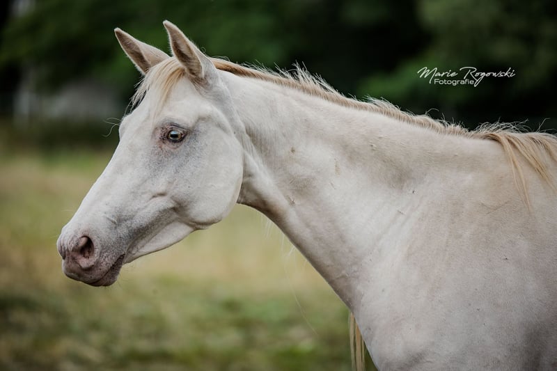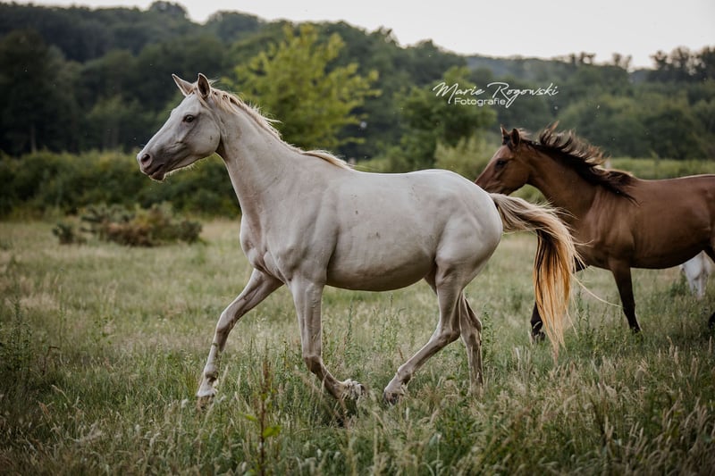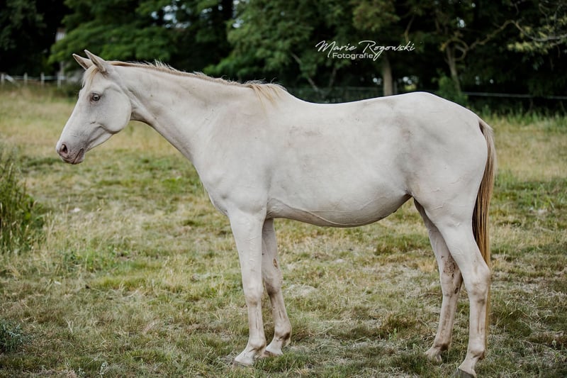 Zangersheide mare | born 2020 | Classic Cream Champagne (E/e, a/a, Ch/n) DELIKATESSE Z combines striking special colouring with significant dressage pedigree. Her sire Desperados FRH was number 1 in the world rankings in 2016 and remains one of the most successful dressage horses of all time – both in terms of sport and breeding. This young mare is sensitive, expressive and has a noble appearance with a harmonious conformation. She is currently unbroken and knows the basic handling procedures. Due to her special genetics (Champagne carrier), she is also suitable for colour-oriented breeding projects in the upper dressage arena.