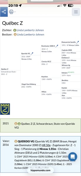 For sale is the 5-year-old mare Québec, a promising young horse from our own breeding program that impresses with quality, attitude, and rideability. Québec was born here and has been carefully and gently trained by myself. She consistently demonstrates a willingness to learn, motivation, and a good overview over jumps. ✨ Current status: - Placed in Young Jumping Horses A - Careful, cautious, and with good technique over fences - Rideable and easy to handle - Clear-minded and reliable in daily work 💛 Québec is absolutely well-behaved, uncomplicated, and friendly with people. ✔️ A current health certificate is available An ideal horse for riders who wish to further develop a young talent with potential – suitable for both ambitious amateurs and competitive riders. ‼️ Sale only to committed and respectful owners ‼️ A trial ride can be arranged for €50.
