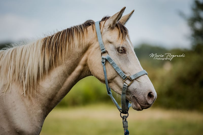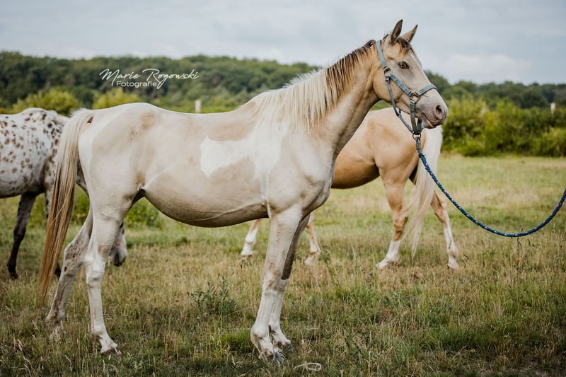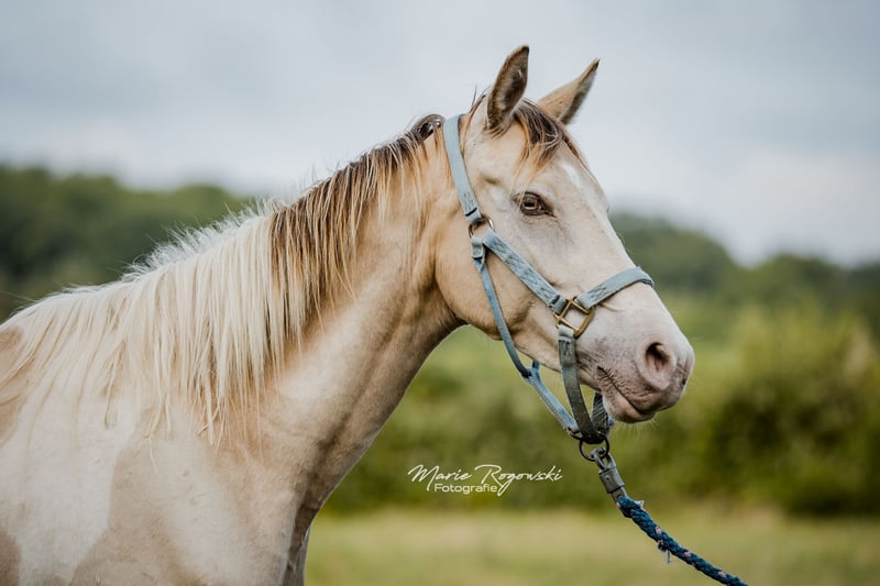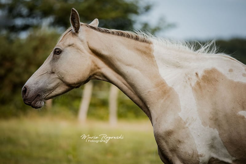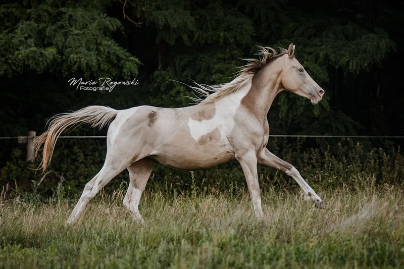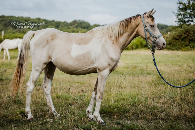 Mare | Zangersheide | Champagne Tobiano | born 2020 | currently 155 cm KHAFFEE AU LAIT Z is an elegant young mare with an unusual colouring – Champagne Tobiano – and athletic lines. She is attentive, well-balanced and friendly in the herd, with confident movements and good presence. With her modern type and interesting genetics, she is suitable both as a future riding horse and for breeding. Her sire, Khaffee Kharamel GF, is a performance-tested Arabian partbred stallion with 93.75% Arabian blood. He is known for his harmonious, expressive offspring, which are in demand both in riding pony breeding and in the warmblood sector. The dam, Magical Dream GF, is a striking Trakehner piebald mare who brings substance, rideability and a clear sporting character to the mix. This pairing combines charisma, colour and proven riding horse quality.