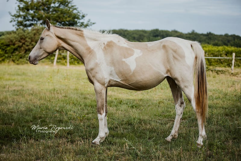Jument | Zangersheide | Champagne Tobiano | née en 2020 | actuellement 155 cm KHAFFEE AU LAIT Z est une jeune jument élégante avec une robe exceptionnelle - Champagne Tobiano - et des lignes athlétiques. Au sein du troupeau, elle se montre attentive, équilibrée et amicale, avec des mouvements assurés et une bonne présence. Avec son type moderne et sa génétique intéressante, elle convient aussi bien comme futur cheval de selle que pour l'élevage. Son père, Khaffee Kharamel GF, est un étalon arab-partbred performant avec 93,75 % de sang arabe. Il est connu pour ses descendants harmonieux et expressifs, très recherchés tant dans l'élevage de poneys de selle que dans le domaine des chevaux à sang chaud. La mère, Magical Dream GF, est une jument Trakehner pie à la robe remarquable qui apporte substance, maniabilité et un caractère clairement sportif. Ce croisement allie charisme, couleur et qualités éprouvées de cheval de selle.