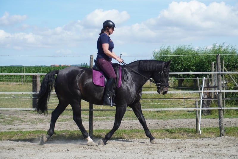 Grootramig recreatie paard, 1,72, 16 jaar, ex springpaard (wil niet springen), ruin. Zeer braaf op de bak, trailer, bij de smid, op vreemd terrein en bij de veearts. Stoer paard. Ruiter is 1.83.