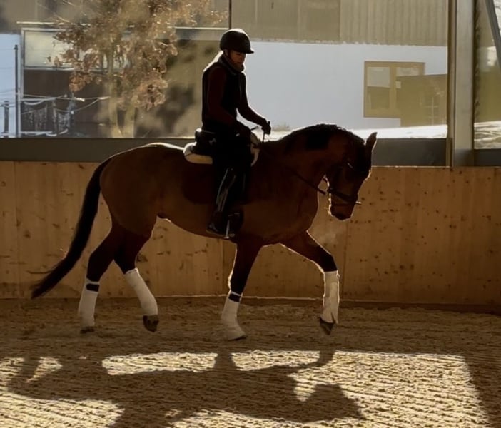 Franky is a 4-year-old gelding, shown in the video riding under saddle for approximately three weeks. He is exceptionally well-behaved, eager to learn, and demonstrates a natural rhythm and impulsion. He is easy to handle, clear-minded, and a pleasure to ride – a horse that truly makes riding enjoyable. Character 10/10. X-rays available, including the back, with no findings.
