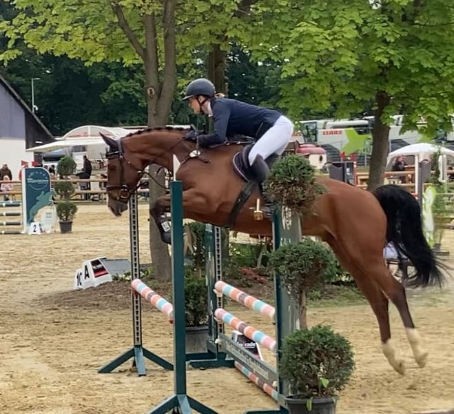 **Sales Advertisement: Belgian Sport Horse** For sale is an impressive Belgian sport horse, a gelding born in 2018. This elegant bay impresses with his excellent jumping talent and balanced nature. He is well-suited for the demanding rider looking for a reliable and powerful horse. With his high willingness to perform and impeccable character, he is suitable for both competition and leisure riding. The gelding is already showing promising progress in jumping and has the potential to establish himself in the competition scene. He is well-mannered, easy to handle, and has a pleasant temperament. X-rays from 05/2024 are available, chip surgery on both fetlock joints in 2024. If you are interested or need further information, please feel free to contact me. Don’t miss out on this great horse!