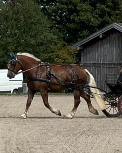 Lieve, hardwerkende Zuid-Duitse koudbloed ruin, in een mooie donkervoskleur met wit langhaar. Gereden Geschikt voor 1-6 spanwagen Vriendelijk bij hoefsmid en tijdens laden Volledig beslagen Te koop wegens vermindering van de voorraad