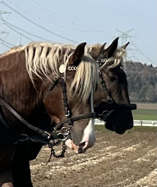 Here you see two geldings that already demonstrate excellent composure and calmness when working at the carriage. Both are driven in pairs and ridden in the field. Currently, they are shod with four shoes and are very well-behaved when visiting the blacksmith. Both can also be purchased individually.